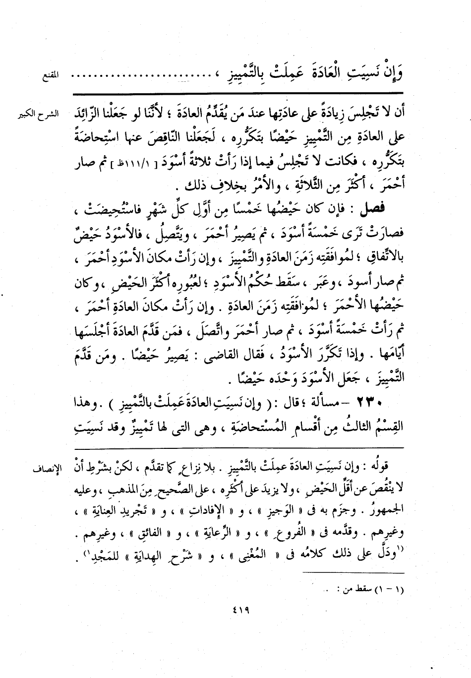 قولُه: وإن نَسِيَتِ العادَةَ عمِلَتْ بالتَّمْييزِ. بلا نِزاعٍ كما تقدَّم، لكنْ بشَرْطِ أنْ لا ينْقُصَ عن أقَلِّ الحَيضِ، ولا يزيدَ على أكْثَرَه، على الصَّحيحِ مِنَ المذهبِ، وعليه الجمهورُ. وجزَم به في «الوَجيزِ»، و «الإِفاداتِ»، و «تَجْريدِ العِنايَةِ»، وغيرِهم. وقدَّمه في «الفُروعِ»، و «الرِّعايَةِ»، و «الفائقِ»، وغيرِهم. [ودَلَّ على ذلك كلامُه في «المُغْنِي»، و «شَرْحِ الهِدايَةِ» للمَجْدِ] (¬1).