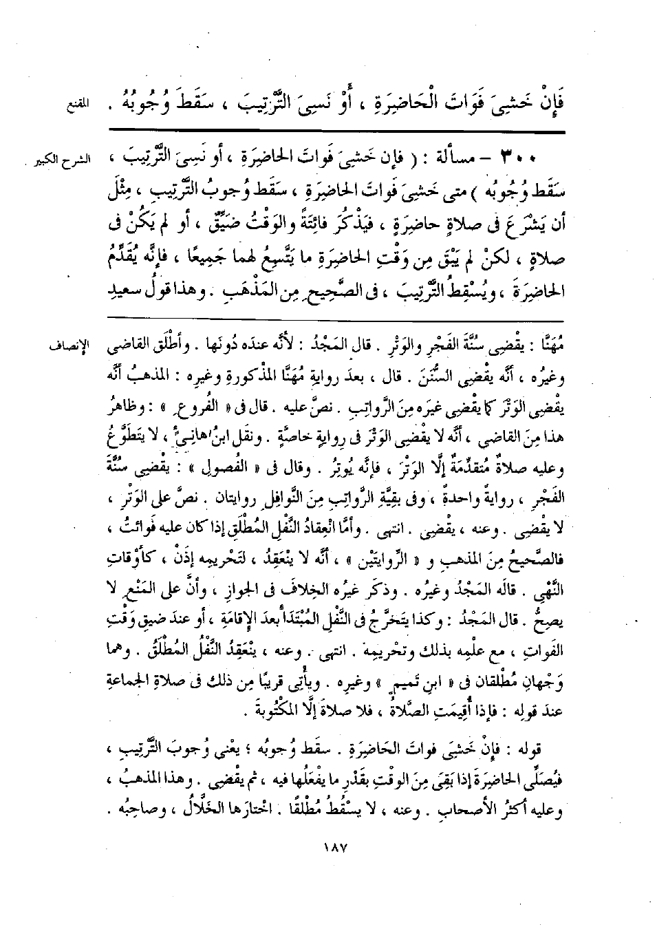 قوله: فإنْ خشىَ فواتَ الحَاضِرَةِ. سقَط وُجوبُه؛ يعنى وُجوبَ التَّرْتِيبِ، فيصَلِّى الحاضِرَةَ إذا بَقىَ مِنَ الوقْتِ بقَدرِ ما يفْعَلها فيه، ثم يقْضى. وهذا المذهبُ، وعليه أكثر الأصحاب. وعنه، لا يسْقط مُطْلقًا. اخْتارها الخَلَّالُ، وصاحبُه.