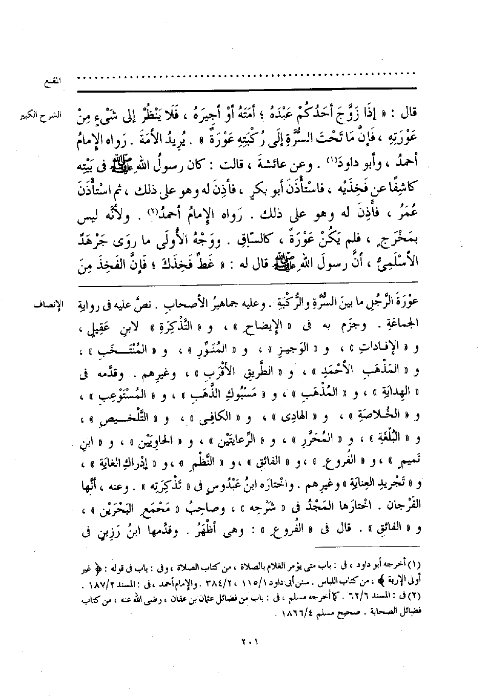 عوْرَةَ الرجُلِ ما بين السُّرةِ والركْبَةِ. وعليه جماهير الأصحابِ. نصَّ عليه في روايةِ الجماعَةِ. وجزَم به فى «الإيضاحِ»، و «التذْكِرَة» لابنِ عَقِيل، «الإفادات»، و «الوجيز»، و «المُنوِّرِ»، و «المنْتخَبِ»، و «المذْهبِ الأحمَد»، و «الطريقِ الأقْرَب»، وغيرهم. وقدَّمه فى «الهِدايةِ»، و «المذهب»، و «مسْبوكِ الذهبِ»، و «المسْتَوْعب»، و «الخلاصة»، و «الهادي»، و «الكافي»، و «التلخيص»، و «البُلْغةِ»، و «المحرَّر»، و «الرعايتين»، و «الحاوِيَيْن»، و «ابن تميم»، و «الفُروعِ»، و «الفائقِ»، و «النظم»، و «إدراكِ الغايَة»، و «تجْريدِ العِنايَة» وغيرِهم. واخْتاره ابنُ عَبْدوسٍ في «تَذْكِرتِه». وعنه، أنَّها الفرجان. اخْتارَها المجد «شرحه»، وصاحِبُ «مَجمَع البحرَين»، و «الفائقِ». قال فى «الفروع»: وهى أظْهر. وقدَّمها ابنُ رَزِين في