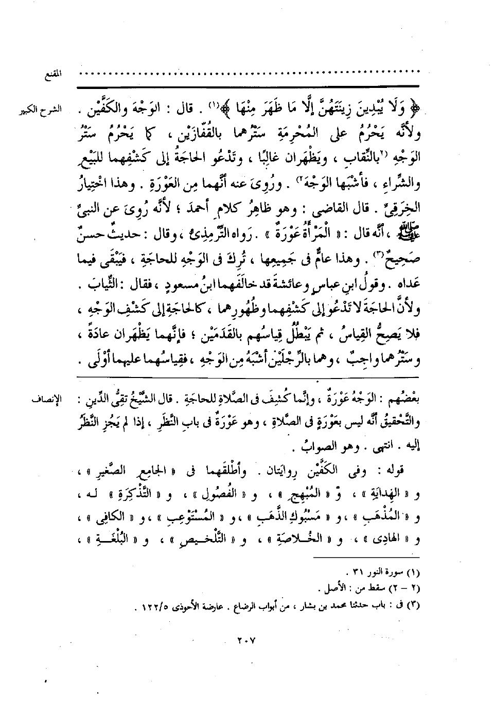 بعضُهم: الوَجْهُ عَوْرةٌ، وإنَّما كُشِف فى الصلاةِ للحاجَةِ. قال الشيخ تقِىُّ الدِّين: والتحقيقُ أنَّه ليس بعَورَةٍ فى الصلاةِ، وهو عَوْرَة فى بابِ النَّظَرِ، إذا لم يجُزِ النَّظَرُ إليه. انتهى. وهو الصوابُ.