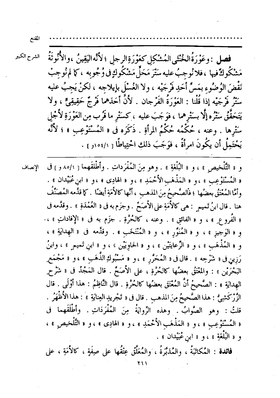 و «التَّلْخيص»، و «البُلْغةِ». وهو مِن المفرَداتِ. وأطْلقهما فى «المُسْتَوعبِ»، و «المَذْهبِ الأحمَد»، و «الهادِى»، و «ابن عبَيْدان». وأما المعتَقُ بعضها؛ فالصَّحيح مِنَ المذهبِ، أنها كالأمَةِ أيضًا. كما قدَّمه المُصَنِّف هنا. قال ابن تميم: هى كالأمَةِ على الأصَح. وجزم به فى «العمدة». وقدَمه فى «الفُروعِ»، و «الفائقِ». وعنه، كالحُرّة. جزَم به فى «الإفاداتِ»، و «الوَجيزِ»، و «المُنَوِّرِ»، و «المنْتخبِ». وقدمه فى «الهِداية»، و «المذهب»، و «الرعايتيْن»، و «الحاويَين»، و «ابنِ تميم»، وابنُ رَزِين فى «شرحِه». قال فى «المُحَررِ»، و «مسْبوكِ الذهبِ»، و «مَجْمَع البحرين»: والمعتَق بعضُها كالحرَّة، على الأصَحِّ. قال المَجْدُ فى «شرح الهدايَة»: الصحيح أن المُعتَقَ بعضُها كالحُرةِ. قال الناظِم: هذا أولَى. قال الزركَشِى: هذا الصَحيحُ مِن المذهبِ. قال فى «تَجْريدِ العنايَة»: هذا الأظهرُ. قلتُ: وهو الصَّوابُ. وهذه الرِّواية مِنَ المفْرَدَات. وأطْلَقَهما فى «المُسْتَوْعِبِ»، و «المَذهب الأحمد»، و «الهادِى»، و «التلْخيص»، و «البلْغة»، و «ابنِ عبَيْدان».