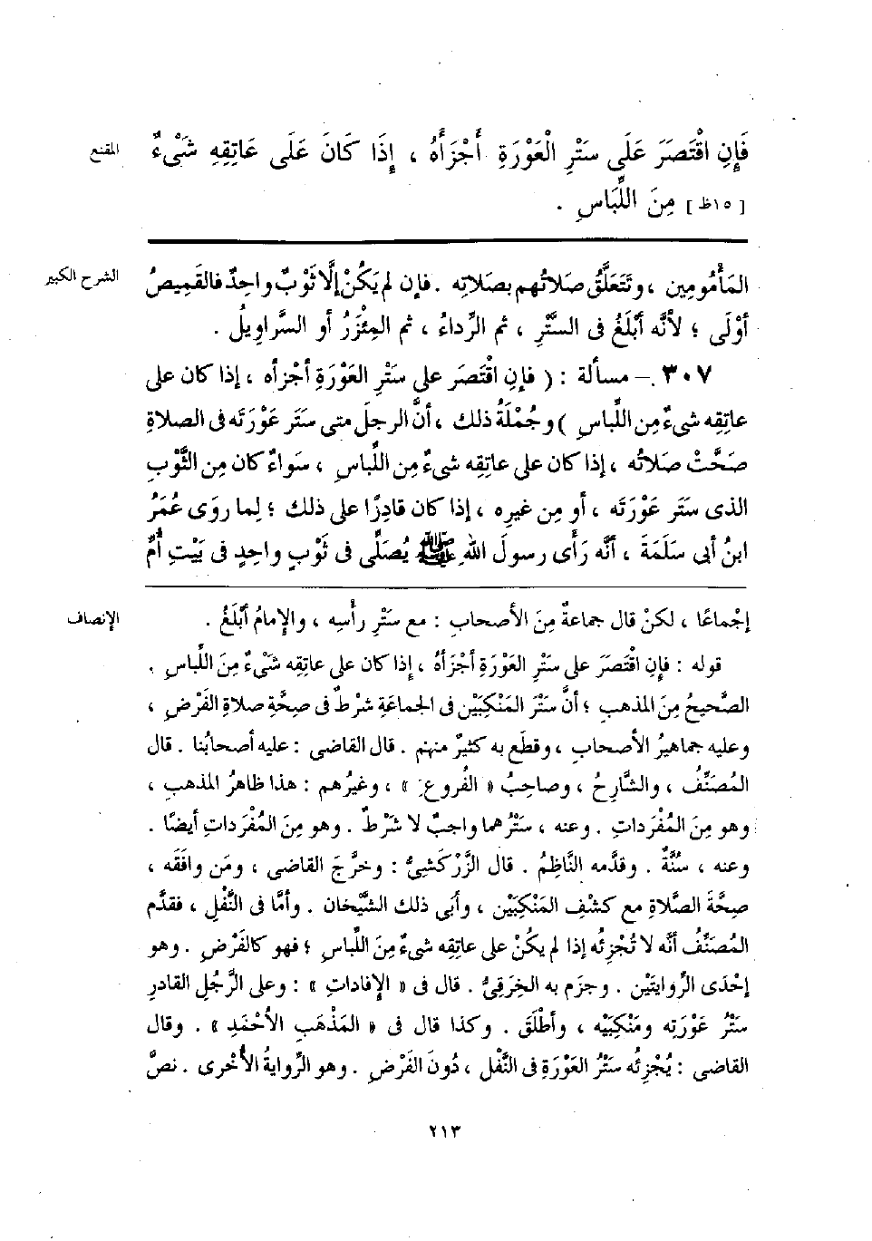 إجْماعًا، لكنْ قال جماعة مِن الأصحابِ: مع سَتْرِ رأسه، والإمام أْبلَغُ. قوله: فإنِ اقْتَصَرَ على سَتْرِ العَوْرَةِ أجْزَأهُ، إذا كان على عاتِقِه شَىْء مِنَ اللِّباس. الصَّحيح مِنَ المذهب؛ أنَّ سَتَر المَنْكِبيْن فى الجماعَةِ شرطٌ فى صِحةِ صلاةِ الفرض، وعليه جماهيرُ الأصحابِ، وقطَع به كثير منهم. قال القاضى: عليه أصحابنا. قال المصَنف، والشَّارح، وصاحِبُ «الفروع»، وغيرُهم: هذا ظاهرُ المذهب، وهو مِنَ المُفرَداتِ. وعنه، ستْرُهما واجبٌ لا شرط. وهو مِن المُفْرداتِ أيضًا. وعنه، سنَّةٌ. وقدمه النَّاظِمُ. قال الزركَشىُّ: وخرجَ القاضى، ومن وافقَه، صحَّة الصَّلاةِ مع كشْفِ المنْكِبَيْن، وأبَى ذلك الشيخان. وأمّا فى النفلِ، فقدَّم المصُنف أنه لا تُجْزِئُه إذا لم يكنْ على عاتِقِه شئ مِن اللباس، فهو كالفَرضِ. وهو إحدى الروايتَيْن. وجزَم به الخِرَقى. قال فى «الإفاداتِ»: وعلى الرَّجُلِ القادرِ ستْرُ عوْرَته ومَنْكِبَيْه، وأطْلق. وكذا قال فى «المَذْهبِ الأحمَدِ». وقال القاضى: يُجزِئُه ستْرُ العَوْرَة فى النَّفْل، دُونَ الفرض. وهو الرِّواية الأخْرى. نص