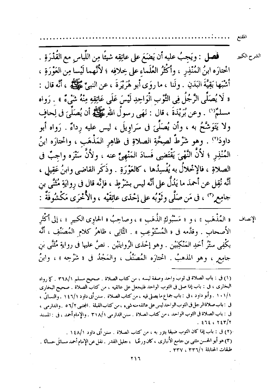 «المُذْهَبِ»، و «مَسْبُوك الذَّهَبِ»، وصاحِبُ «الحاوِي الكبيرِ»، إلى أكثَرِ الأصحاب. وقدَّمه في «المُسْتَوْعِبِ». الثَّاني، ظاهرُ كلامِ المُصَنِّفِ، أنَّه يكْفِي ستْرُ أحَدِ المَنْكِبَيْن. وهو إحْدَى الرِّوايتَيْن. نصَّ عليها في روايةِ مُثَنَّى بنِ جامِعٍ، وهو المذهبُ. اخْتارَه المُصَنِّفُ، والمَجْدُ في «شَرْحِه»، وابنُ