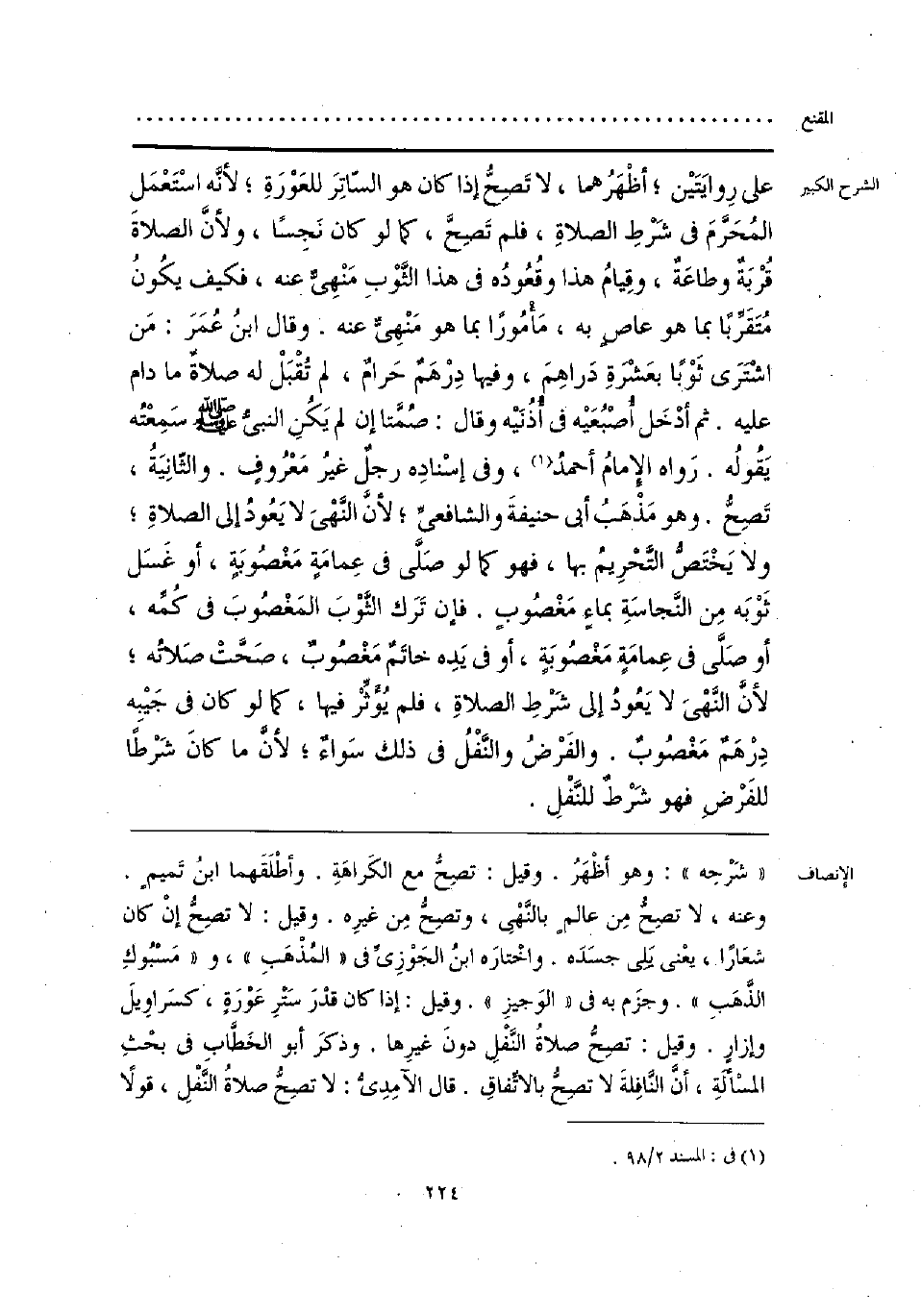 «شَرْحِه»: وهو أظْهَرُ. وقيل: تصِحُّ مع الكَراهَةِ. وأطْلَقَهما ابن تَميمٍ. وعنه، لا تصِحُّ مِن عالم بالنَّهْيِ، وتصِحُّ بن غيرِه. وقيل: لا تصِحُّ إنْ كان شعَارًا، يعْنى يَلِي جسَدَه. واخْتاره ابنُ الجَوْزِي في «المذْهَبِ»، و «مَسْبُوكِ الذَّهَبِ». وجزَم به في «الوَجيزِ». وقيل: إذا كان قدْرَ سَتْرِ عَوْرَةٍ، كسَراوِيلَ وإزارٍ. وقيل: تصِحُّ صلاة النَّفْلِ دونَ غيرِها. وذكرَ أبو الخَطَّاب في بحْثِ المسْألةِ، أنَّ النَّافِلةَ لا تصِح بالاتِّفاقِ. قال الآمِدِيُّ: لا تصِحُّ صلاة النَّفْلِ، قولًا