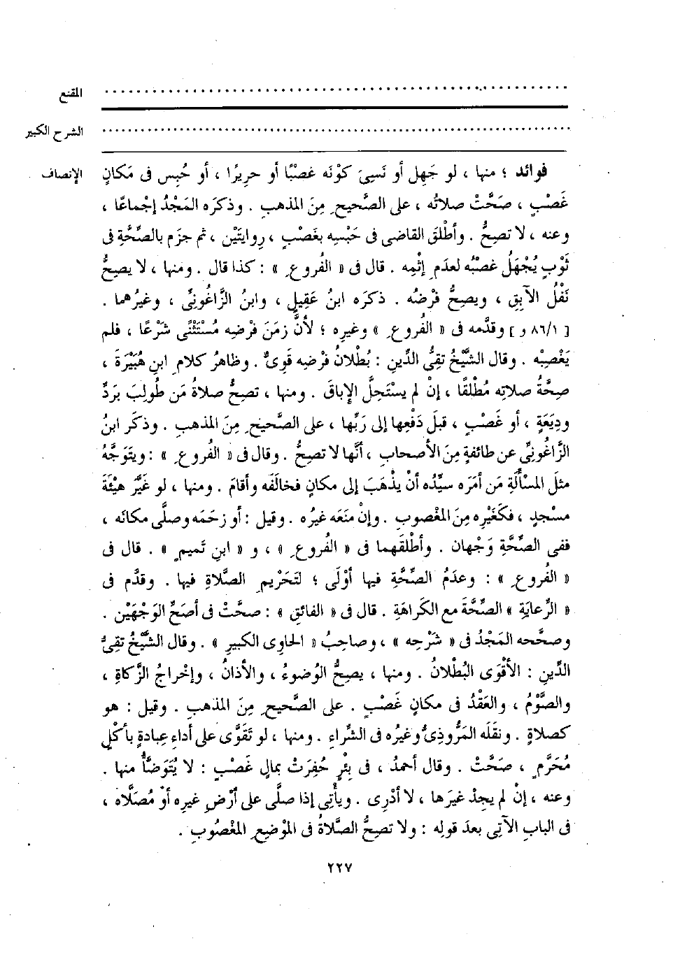 فوائد؛ منها، لو جَهِل أو نَسِيَ كوْنَه غصْبًا أو حرِيرًا، أو حُبِس في مَكانٍ غَصْبٍ، صَحَّتْ صلاتُه، على الصَّحيحِ مِنَ المذهبِ. وذكرَه المَجْدُ إجْماعًا، وعنه، لا تصِحُّ. وأطْلق القاضي في حَبْسِه بغَصْبٍ، رِوايتَيْن، ثم جزَم بالصَّحَّةِ في ثَوْبٍ يُجْهَل غصْبُه لعدَمِ إثْمِه. قال في «الفروعِ»: كذا قال. ومنها، لا يصِحُّ نَفْل الآبِقِ، ويصِحُّ فْرضُه. ذكرَ ابن عَقِيلٍ، وابن الزَّاغُونِيِّ، وغيرهما. وقدَّمه في «الفروعِ»: غيرِه؛ لأنَّ زمَنَ فرْضِه مُستَثْنًى شَرْعًا، فلم يَغْصِبه. وقال الشَّيْخُ تقِيُّ الدِّينِ: بُطْلان فرْضِه قَوِيٌّ. وظاهرُ كلام ابنِ هُبَيْرَة، صِحَّة صلاته مُطْلقًا، إنْ لم يسْتَحِلَّ الإِباقَ. ومنها، تصِحُّ صلاة مَن طُولِبَ بردِّ ودِيَعَةٍ، أو غَصْب، قبلَ دَفْعِها إلى رَبِّها، على الصَّحيحِ مِنَ المذهبِ. وذكَر ابنُ الزَّاغُونِيِّ عن طائفةٍ بنَ الأصحابِ، أنَّها لا تصِح. وقال في «الفروعِ»: ويتَوَجَّهُ مثلَ المسْألةِ مَن أمَره سيِّدُه أنْ يذْهَبَ إلى مكانٍ فخالَفه وأقامَ. ومنها، لو غَيَّرَ هيْئَة مسْجدٍ، فكَغَيْره مِن المغْصوبِ. وإنْ منَعَه غيرُه. وقيل: أو رحَمَه وصلَّى مكانَه، ففي الصِّحَّة وجْهان. وأطْلقَهما في «الفروعِ»، و «ابنِ تَميمٍ». قال في «الفُروعِ»: وعدَمُ الصِّحَّةِ فيها أوْلَى، لتَحَرْيم الصَّلاةِ فيها. وقدَّم في «الرِّعايَةِ» الصِّحَّةَ مع الكَراهَةِ. قال في «الفائقِ»: صحَّتْ في أصَحَّ الوَجْهَيْن. وصحَّحه المَجْدُ في «شَرْحِه»، وصاحِبُ «الحاوِي الكبيرِ». وقال الشَّيْخُ تقِيُّ الدِّينِ: الأقْوى البُطْلان. ومنها، يصِحُّ الوُضوء، والأذانُ، وإخْراجُ الزَّكاةِ، والصَّوْمُ، والعَقْدُ في مكانٍ غَصْبٍ. على الصَّحيحِ مِن المذهبِ. وقيل: هو كصلاةٍ. ونَقَله المَرُّوذِيُّ وغيره في الشِّراءِ. ومنها، لو تَقَوَّى على أداءِ عِبادةٍ بأكْلِ مُحَرَّمٍ، صَحَّتْ. وقال أحمدُ، في بِئْر حُفِرَتْ بمالٍ غَصْبٍ: لا يتَوضَّأُ منها. وعنه، إنْ لم يجِدْ غيرَها، لا أدْرِي. ويأتِي إذا صلَّى على أرْضٍ غيره أو مُصَلَّاه، في البابِ الآتِي بعدَ قولِه: ولا تصِحُّ الصَّلاةُ في الموْضِع المغْصُوبِ.
