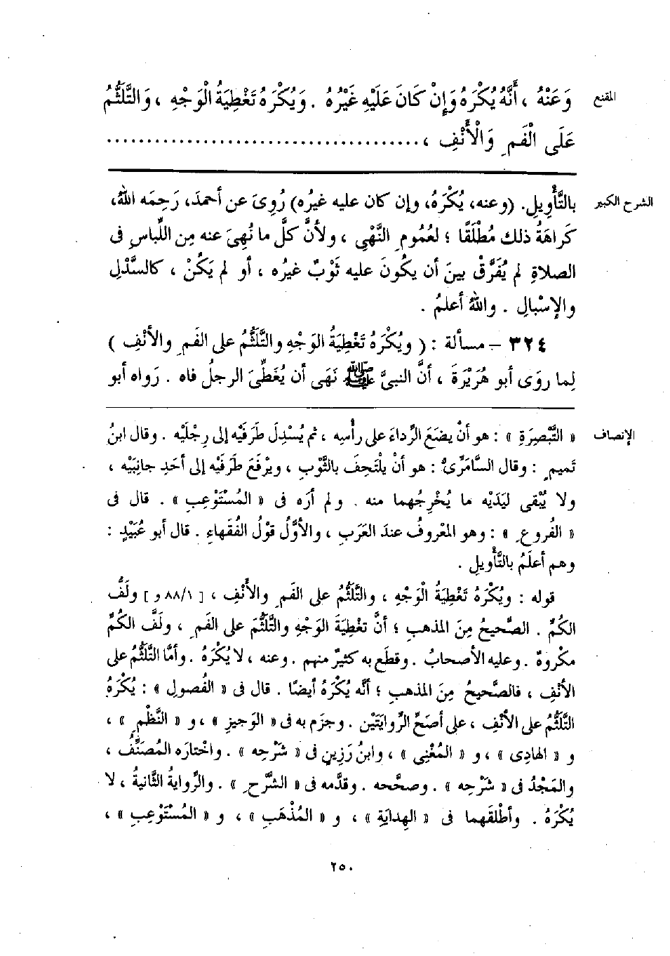 قوله: ويُكْرَه تَغْطِية الْوَجْهِ، والتَّلثمُ على الفَمِ والأنْفِ، ولَفُّ الكُمُّ. الصحيحُ مِنَ المذهبِ؛ أن تغْطِيةَ الوَجْهِ والتلثُّمَ على الفَم، ولَفَّ الكُمِّ مكْروة. وعليه الأصحابُ. وقطَع به كثيرٌ منهم. وعنه، لا يُكْرَه. وأمَّا التَّلثُّمُ على الأنفِ، فالصَّحيحُ مِنَ المذهبِ؛ أنَّه يُكْرَه أَيضًا. قال في «الفصولِ»: يُكْرَه التلثُّمُ على الألفِ، على أصَح الروايتيْن. وجزَم به في «الوجيزِ»، و «النظْم»، و «الهادِي»، و «المُغْنِي»، وابنُ رَزِين في «شرحِه». واخْتاره المُصَنِّفُ، والمَجْدُ في «شرحِه». وصحَّحه. وقدَّمه في «الشرحِ». والرِّواية الثَّانيةُ، لا يكْرَه. وأطْلقهما في «الهِداية»، و «المُذْهَبِ»، و «المُسْتَوْعِبِ»،