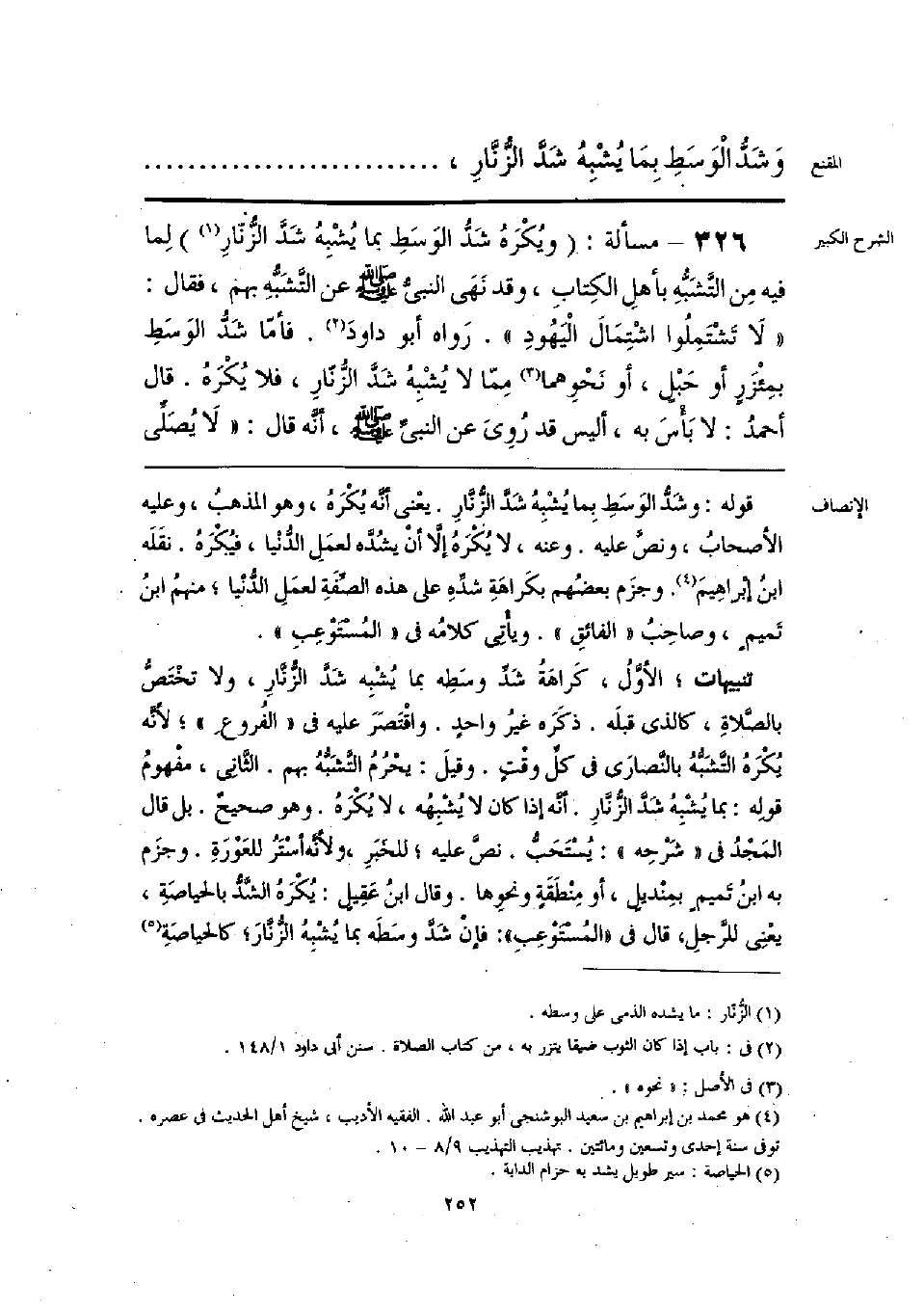 تنبيهات؛ الأول، كَراهَةُ شَدِّ وسطِه بما يُشْبِه شد الزنار، ولا تخْتَصُّ بالصلاةِ، كالذى قبلَه. ذكَرَه غيرُ واحدٍ. واقْتَصَرَ عليه في «الفُروعِ»؛ لأنه يكْرَه التشبُّهُ بالنصارَى في كل وقْتٍ. وقيلَ: يحْرُمُ التشبُّهُ بهم. الثاني، مفْهومُ قوله: بما يُشْبِهُ شَدَّ الزُّنَّار. أنَّه إذا كان لا يُشْبِهه، لا يُكرَة. وهو صحيحٌ. بل قال المَجْدُ في «شرْحِه»: يُستحبُّ. نصَّ عليه؛ للخبَرِ، ولأنه أسْتَرُ للعَوْرَةِ. وجزَم به ابن تميم بمِنْديل، أو مِنْطَقَةٍ ونحوِها. وقال ابنُ عَقِيل: يُكْرَه الشَّدُّ بالحياصَةِ، يعني للرجلِ، قال في «المستوْعِبِ»: فإنْ شَد وسَطَه بما يُشْبهُ الزنَّارَ؛ كالحياصَةِ (¬2)