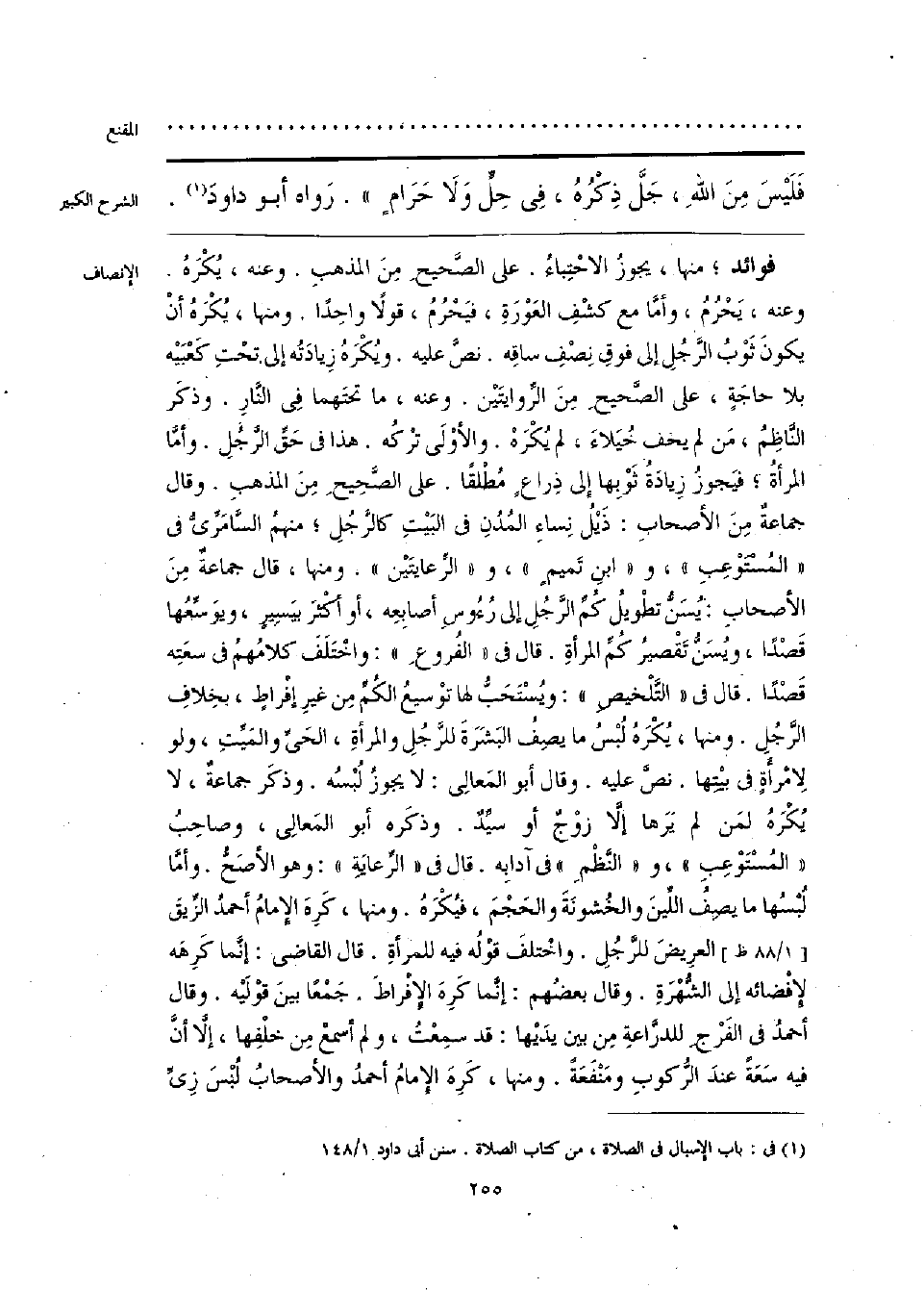 فوائد؛ منها، يجوز الاحتباء. على الصحيح منَ المذهبِ. وعنه، يُكْرَه. وعنه، يَحْرُمُ، وأمَّا مع كشْفِ العَوْرَةِ، فيَحْرُمُ، قولًا واحدًا. ومنها، يُكْرَه أنْ يكونَ ثوْب الرَّجل إلى فوقِ نِصْفِ ساقه. نصَّ عليه. ويكْرَه زِيادَته إلى تحت كَعْبَيْه بلا حاجَةٍ، على الصَّحيحِ بن الروايتيْن. وعنه، ما تحتهما فِي النَّار. وذكَر الناظِمُ، مَن لم يخف خيَلاء، لم يُكْرَه. والأوْلَى ترْكه. هذا في حَقِّ الرجلِ. وأما المرأة؛ فيجوزُ زِيادة ثَوْبِها إلى ذراع مطْلقًا. على الصَّحِيحِ مِن المذهبِ. وقال جماعة مِن الأصحابِ: ذَيْلُ نِساءِ المدنِ في البَيْتِ كالرَّجلِ؛ منهم السامَريُّ في «المستَوْعبِ»، و «ابنِ تَميم»، و «الرّعايتيْن». ومنها، قال جماعة مِنَ الأصحابِ: يُسَنُّ تطْويل كمِّ الرّجلِ إلى رءوسِ أصابِعِه، أو أكثر بيسِير، ويوَسعها قَصْدًا، ويسن تَقْصير كمِّ المرأة. قال في «الفروعِ»: واخْتَلَفَ كلامهم في سعَتِه قَصْدًا. قال في «التلْخيص»: ويسْتَحَبُّ لها توْسيع الكمِّ مِن غيرِ إفْراطٍ، بخِلافِ الرجلِ. ومنها، يكْرَه لُبْس ما يصِف البَشرَةَ للرجُلِ والمرأةِ، الحَى والميت، ولو لِامرأة في بيْتها. نصَّ عليه. وقال أبو المعالِي: لا يجوز لبْسُه. وذكر جماعةٌ، لا يُكْرهُ لمَن لم يرها إلَّا زوْجٌ أو سيدٌ. وذكَره أبو المَعالِي، وصاحِبُ «المستوعب»، و «النظْم» في آدابه. قال في «الرعاية»: وهو الأصَح. وأما لُبْسها ما يصِف اللِّينَ والخُشونةَ والحجمَ، فيكْرَهُ. ومنها، كَرِه الإمامُ أَحْمد الزِّيق، العرِيضَ للرَّجُلِ. واخْتلفَ قوْله فيه للمرأةِ. قال القاضي: إنما كَرِهَه لإفْضائه إلى الشهْرَةِ. وقال بعضهم: إنَّما كَرِهَ الإفْراطَ. جَمْعًا بينَ قوْلَيْه. وقال أَحْمد في الفرْج للدرَّاعةِ مِن بين يدَيْها: قد سمِعْت، ولم أسمع خلْفِها، إلَّا أنَّ فيه سعَةً عندَ الرّكوبِ ومَنْفَعَة. ومنها، كَرِهَ الإمام أحمدُ والأصحابُ لبسَ زِيِّ
