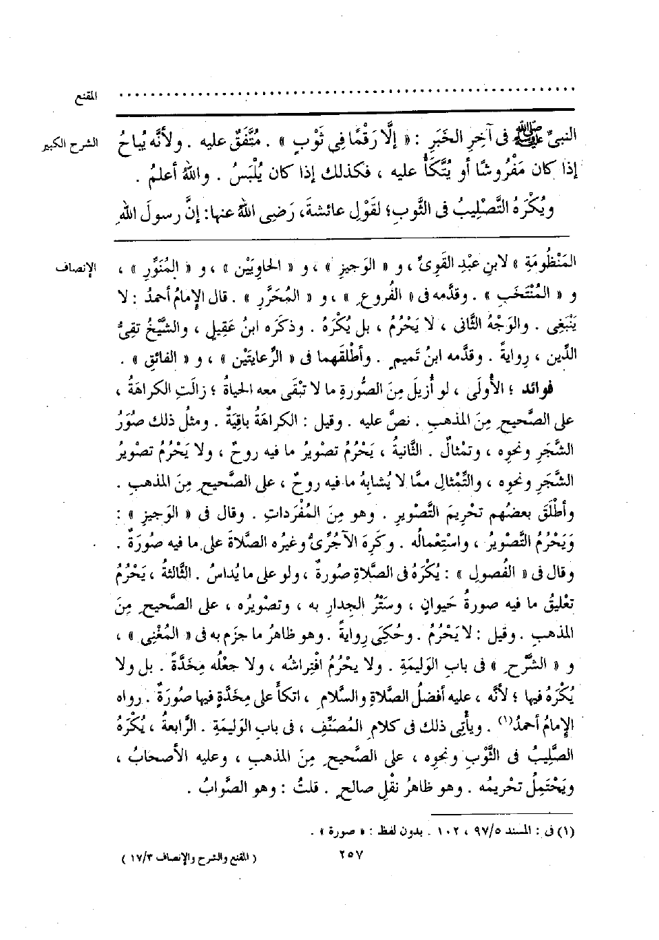 فوائد؛ الأولى، لو أُزيلَ منَ الصورة ما لا تبْقَى معه الحياةُ؛ زالَتِ الكراهَة، على الصحيح من المذهبِ. نصَّ عليه. وقيل: الكراهَة باقِية. ومثلُ ذلك صور الشجرِ ونحوِه، وتمثال. الثانيةُ، يَحْرُم تصْوير ما فيه روحٌ، ولا يَحْرم تصْوير الشجَرِ ونحوِه، والتمْثالِ مما لا يشابِه ما فيه روحٌ، على الصحيحِ مِنَ المذهبِ. وأطْلَقَ بعضهم تحْرِيمَ التصْويرِ. وهو مِنَ المفْرَداتِ. وقال في «الوَجيزِ»: وَيَحْرم التصْوير، واستعماله. وكَرهَ الآجريُّ وغيره الصلاةَ على ما فيه صورَة. وقال في «الفصولِ»: يُكْرَهُ في الصَّلاةِ صورة، ولو على ما يُداسُ. الثالثةُ، يَحْرُمُ تعْليقُ ما فيه صورةُ حيوانٍ، وستْرُ الجِدارِ به، وتصْويره، على الصَّحيحِ مِن المذهبِ. وقيل: لا يَحْرم. وحكِيَ رِوايةً. وهو ظاهر ما جزَم به في «المُغْنِي»، و «الشرحِ» في بابِ الوَليمَةِ. ولا يحْرم افْتِراشه، ولا جعْلُه مِخدَّة. بل ولا يكْرَه فيها؛ لأنه، عليه أفضلُ الصلاةِ والسلامِ، اتكأ على مِخَدةٍ فيها صورةٌ. رواه الإمام أَحْمد (¬1). ويأتي ذلك في كلامِ المصَنِّفِ، في بابِ الوَليمَة. الرابعةُ، يُكْرَه الصلِيبُ في الثوْب ونحوه، على الصَّحيحِ مِن المذهبِ، وعليه الأصحابُ، ويَحْتَمِلُ تحْريمُه. وهو ظاهرُ نقْلِ صالحٍ. قلتُ: وهو الصَّوابُ.