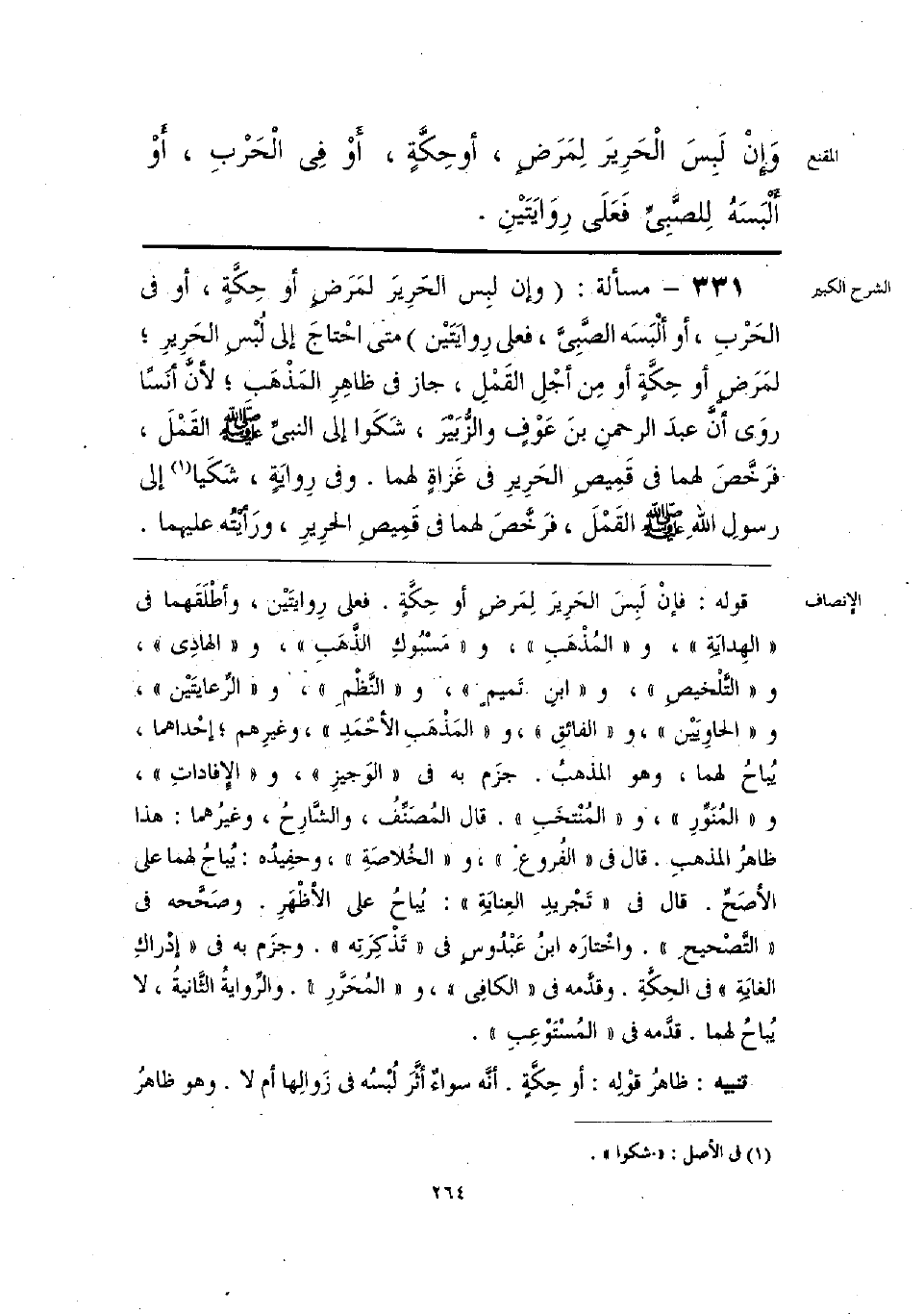 قوله: فإنْ لَبِسَ الحَرِيرَ لِمرض أو حكَّةٍ. فعلى رِوايتيْن، وأطْلقهما في «الهِدايَةِ»، و «المذْهبِ»، و «مَسْبُوكِ الذَّهَبِ»، و «الهادِي»، و «التلْخيص»، و «ابنِ تَميمٍ»، و «النَّظم» و «الرعايتَيْن»، و «الحاوِيَيْن»، و «الفائقِ»، و «المَذْهبِ الأحْمَدِ»، وغيرهم؛ إحْداهما، يُباح لهما، وهو المذهب. جزَم به في «الوَجيزِ»، و «الإفاداتِ»، و «المنَورِ»، و «المُنْتخَبِ». قال المصنف، والشارح، وغيرهما: هذا ظاهر المذهبِ. قال في «الفروع»، و «الخلاصَةِ»، وحفِيدُه: يُباح لهما على الأصَحِّ. قال في «تجْريد العِنايَة»: يُباحُ على الأظْهرِ. وصَحَّحه في «التَّصحيح». واخْتارَه ابنُ عبْدُوس في «تَذكِرَتِه». وجزَم به في «إدْراكِ الغايِة» في الحِكَّةِ. وقدَّمه في «الكافي»، و «المحرَّرِ». والرِّواية الثَّانية، لا يُباحُ لهما. قدَّمه في «المسْتوْعِبِ».