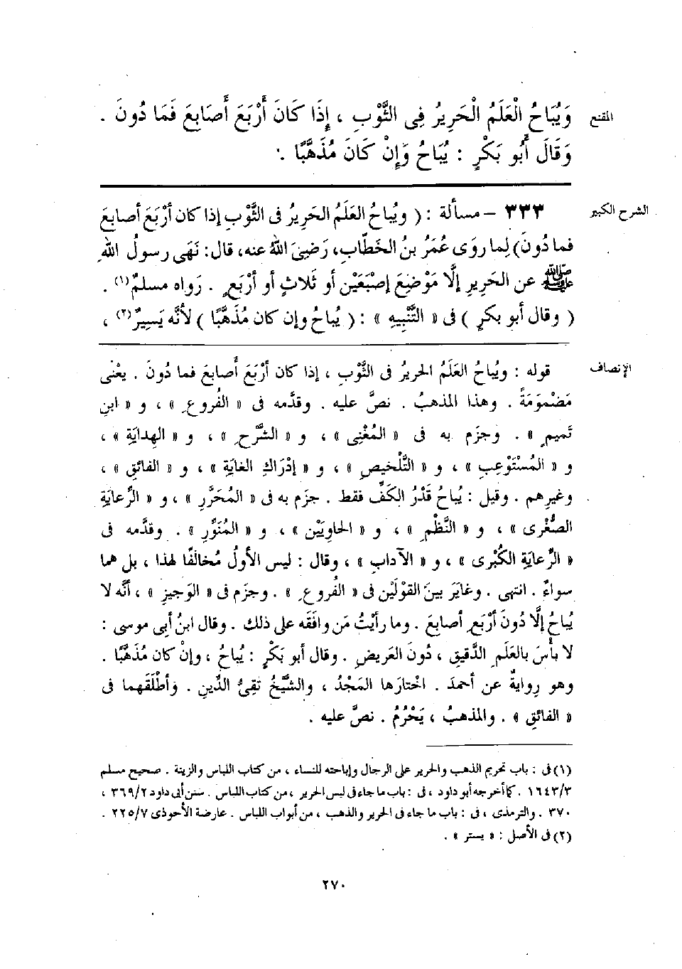 قوله: ويباحُ العَلم الحريرْ في الثَّوْب، إذا كان أرْبَعَ أصابعَ فما دون. يعْنى مضْموَمَةً. وهذا المذهبُ. نصَّ عليه. وقدَّمه في «الفُروعِ»، و «ابنِ تميم». وجزَم به في «المُغْنى»، و «الشرح»، و «الهِداية»، و «المسْتوْعِبِ»، و «التلْخيص»، و «إدْرَاك الغايةِ»، و «الفائقِ»، وغيرهم. وقيل: يباح قَدْرُ الكف فقط. جزم به في «المحَرْرِ»، و «الرعايةِ الصُّغْرى»، و «النَّظْمِ»، و «الحاوِيَيْن»، و «المنَوِّر». وقدَّمه في «الرعاية الكبْرى»، و «الآداب»، وقال: ليس الأولُ مُخالفا لهذا، بل هما سواءٌ. انتهى. وغايَر بين القوْلَيْن في «الفروعِ». وجزم في «الوَجيز»، أنَّه لا يباح إلَّا دونَ أرْبَع أصابعَ. وما رأيتُ مَن وافقَه على ذلك. وقال ابن أبِي موسى: لا بأسَ بالعلَمِ الدَّقيقِ، دُونَ العَريض. وقال أبو بكر: يُباح، وإن كان مذهبا. وهو رِواية عن أَحْمد. اخْتارَها المَجْدُ، والشيخ تقِي الدينِ. وأطْلقهما في «الفائق». والمذهبُ، يَحْرُمُ. نص عليه.
