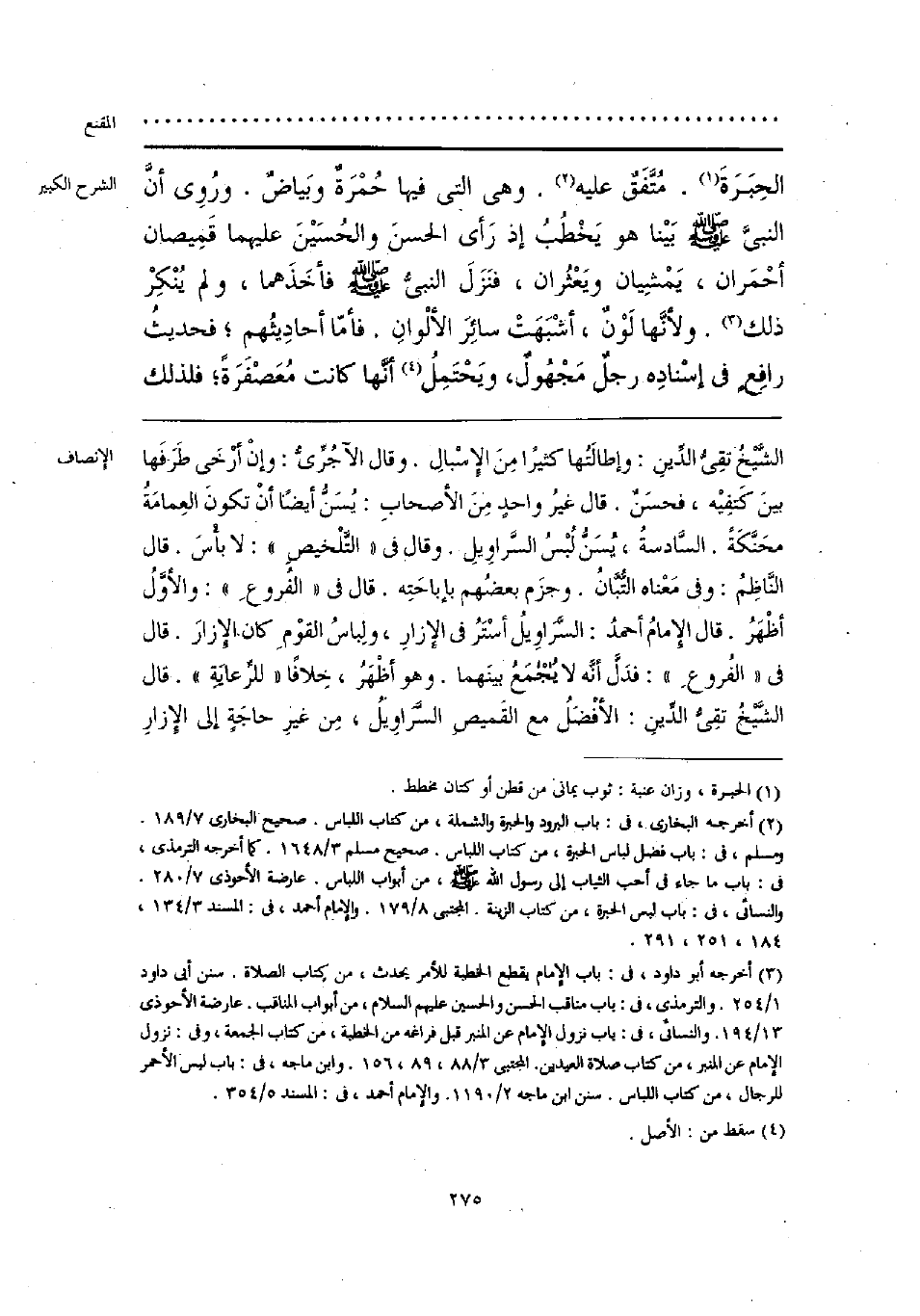 الشيخ تقي الدِّينِ: وإطالَتها كثيرًا مِنَ الإسْبالِ. وقال الآجرِّي: وإنْ أرْخَى طَرَفَها بين كَتفيْه، فحسَنٌ. قال غيرُ واحدٍ من الأصحابِ: يُسَنُّ أَيضًا أنْ تكونَ العِمامَة محَنّكةً. السَّادسة، يُسَنُّ لبسُ السراوِيلِ. وقال في «التلْخيصِ»: لا بأسَ. قال النَّاظم: وفي مَعْناه التُّبَّانُ. وجزَم بعضُهم بإباحته. قال في «الفُروعِ»: والأول أظْهَرُ. قال الإمام أحمدُ: السراوِيل أسْتَرُ في الإزارِ، ولِباس القوْم كان الإزار. قال في «الفروعِ»: فدَلَّ أنَّه لا يُجمَعُ بينَهما. وهو أظهَر، خِلافًا «للرِّعايةِ». قال الشيخُ تقيُّ الدينِ: الأفْضَل مع القميص السَّراوِيلُ، مِن غير حاجَةٍ إلى الإزارِ