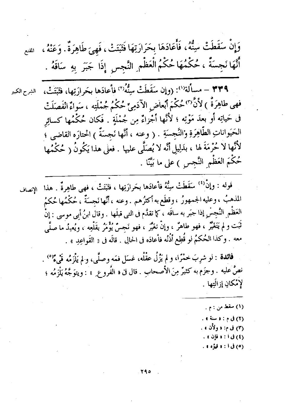 قوله: وإن (¬1) سقَطَتْ سِنُّه فأعادَها بحَرارَتِها، فثبَتَتْ، فهي طاهِرة. هذا المذهبُ، وعليه الجمهور، وقطَع به أكثرهم. وعنه، أنها نجِسَة، حكْمها حكم العَظْمِ النجِس إذا جبر به ساقه، كما تقدَّم في التى قبلَها. وقال ابنُ أبِي موسى: إنْ ثَبَت ولم يَتغَير، فهو طاهرٌ، وإنْ تغيَّر، فهو نَجسٌ يُؤمرُ بقَلْعِه، ويُعيد ما صلَّى معه. وكذا الحكم لو قُطِع أذنُه فأعادَه في الحالِ. قالَه في «القواعِدِ».