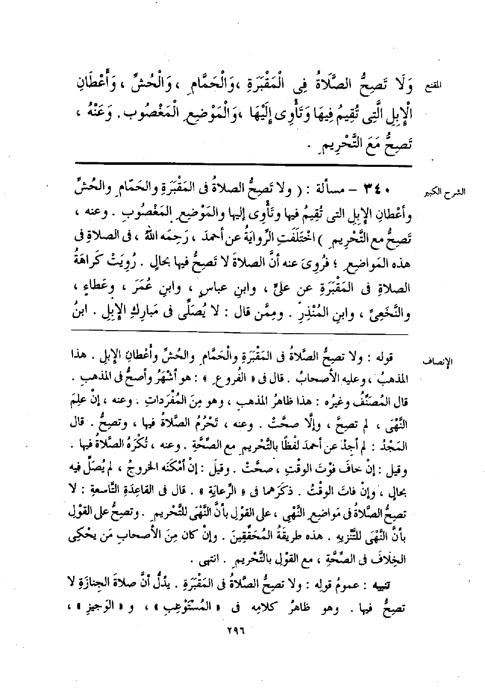 قوله: ولا تصِح الصَّلاةُ في المَقْبَرة والْحمّامِ والحشُّ وأعْطانِ الإبلِ. هذا المذهب، وعليه الأصحابُ. قال في «الفُروع»: هو أشْهَر وأصح في المذهبِ. قال المُصَنفُ وغيرُه: هذا ظاهر المذهبِ، وهو مِنَ المُفْرَداتِ. وعنه، إنْ علِمَ النَّهْىَ، لم تصح، وإلا صحتْ. وعنه، تَحْرُمُ الصلاةُ فيها، وتصِح. قال المَجْد: لم أجِدْ عن أحمدَ لفْظًا بالتحْريمِ مع الصحةِ. وعنه، تكْره الصلاةُ فيها. وقيل: إن خافَ فوْت الوقتِ، صحتْ. وقيلَ: إن أمْكَنَه الخروج, لم يُصَل فيه بحالٍ، وإنْ فاتَ الوقتُ. ذكَرَهما في «الرعايةِ». قال في القاعِدَة التاسعةِ: لا تصِحُّ الصلاة في مَواضِع النهْيِ، على القوْلِ بأن النهْىَ للتحْريمِ. وتصِح على القوْل بأن النهْىَ للتنزيه. هذه طريقةُ المُحَققين. وإنْ كان منَ الأصحابِ مَن يحكِي الخِلاف في الصحة، مع القوْلِ بالتحْريمِ. انتهى.