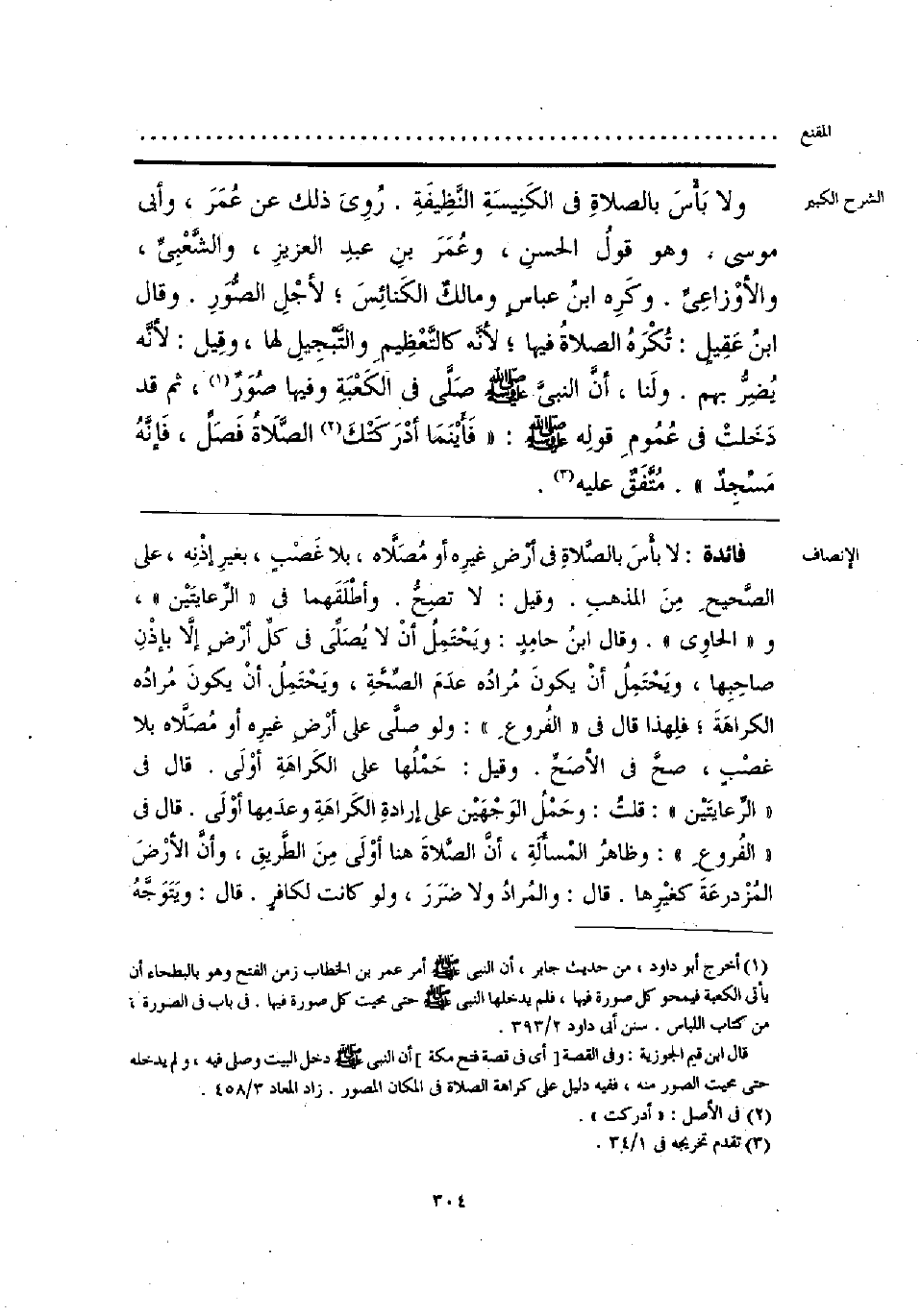 فائدة: لا بأسَ بالصَّلاةِ في أرض غيرِه أو مصلاه، بلا غصْب، بغيرِ إذْنِه، على الصحيحِ مِنَ المذهب. وقيل: لا تصِح. وأطْلَقَهما في «الرِّعايتَيْن»، و «الحاوِي». وقال ابنُ حامد: ويحْتَمل أنْ لا يصَلًى في كلِّ أرْض إلَّا بإذْنِ صاحِبها، ويَحْتَملُ أنْ يكون مُرادُه عدمَ الصحةِ، ويحْتمل. أنْ يكون مرادُه الكراهةَ؛ فلِهذا قال في «الفروعِ»: ولو صلى على أرْضِ غيرِه أو مصلاه بلا غصب، صح في الأصَح. وقيل: حَملها على الكراهَةِ أوْلَى. قال في «الرعايتيْن»: قلتُ: وحَمْل الوَجْهَيْن على إرادةِ الكَراهَةِ وعدَمها أوْلَى. قال في «الفُروعِ»: وظاهرُ المْسألةِ، أنَّ الصَّلاةَ هنا أوْلى مِن الطريقِ، وأن الأرْضَ المزْدرعَةَ كغيرها. قال: والمرادُ ولا ضرر، ولو كانت لكافر. قال: ويتَوجَّه