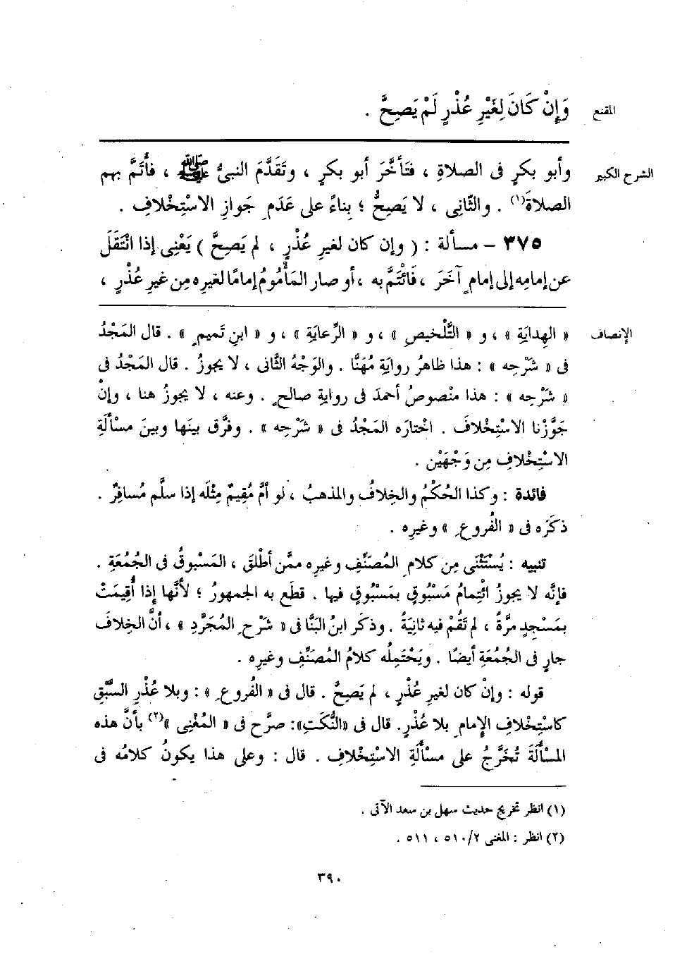 قوله: وإنْ كان لغيرِ عُذرٍ، لم يَصِحَّ. قال في «الفُروعِ»: وبلا عُذْرِ السَّبْقِ كاسْتِخْلافِ الإمام بلا عُذْرٍ. قال في «النُّكَتِ»: صرَّح في «المُغنِي» (¬1) بأنَّ هذه المسْألةَ تُخَرَّجُ على مسْألَةِ الاسْتِخْلافِ. قال: وعلى هذا يكونُ كلامُه في