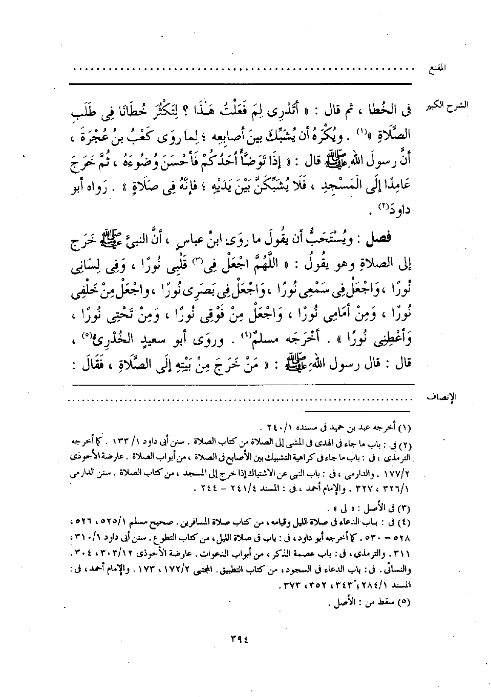 فصل: ويُسْتحَبُّ أن يقُولَ ما روَى ابنُ عباسٍ، أن النبيَّ -صَلَّى اللهُ عَلَيْهِ وَسَلَّم- خَرَج إلى الصلاةِ وهو يقُولُ: «اللَّهُم اجْعَلْ في (¬3) قَلْبِي نُورًا، وَفِي لِسَانِي نُورًا، وَاجْعَلْ في سَمْعِي نُورًا، وَاجْعَلْ في بَصَرِي نُورًا، واجْعَلْ مِنْ خَلْفِي نُورًا، ومِنْ أمَامِي نُورًا، وَاجْعَلْ مِنْ فوْقِي نُورًا، وَمِنْ تَحْتِي نُورًا، وَأعْطِنى نُورًا». أخْرَجَه مسلمٌ (¬4). وروَى أبو سعيدٍ الخُدْرِيُّ (¬5) قال: قال رسول الله -صَلَّى اللهُ عَلَيْهِ وَسَلَّم-: «مَن خَرَجَ مِنْ بيْتِهِ إلَى الصَّلَاةِ، فَقَالَ: