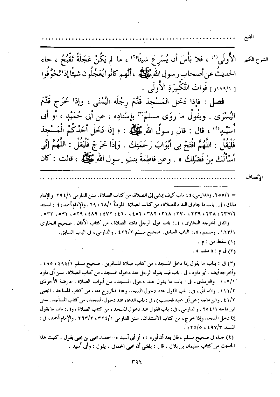 فصل: فإذا دَخَل المَسْجِدَ قدَّمَ رِجْلَه اليُمْنَى، وإذا خَرَج قَدَّم اليُسْرَى. ويقُولُ ما روَى مسلمٌ (¬3) بإسْنادِه، عن أبي حمُيْدٍ، أو أبي أُسَيّدٍ (¬4)، قال: قال رسولُ الله -صَلَّى اللهُ عَلَيْهِ وَسَلَّم-: «إذَا دَخَل أحَدُكُمُ الْمَسْجدَ فَلْيَقُلْ: اللَّهُمَّ افْتَحْ لِي أبْوَابَ رَحْمَتِكَ. وَإذَا خَرَجَ فَلْيَقُلْ: اللَّهُمَّ إنِّي أسْألُكَ مِنْ فَضْلِكَ». وعن فاطِمَة بنتِ رسوِل الله -صَلَّى اللهُ عَلَيْهِ وَسَلَّم-، قالت: كان