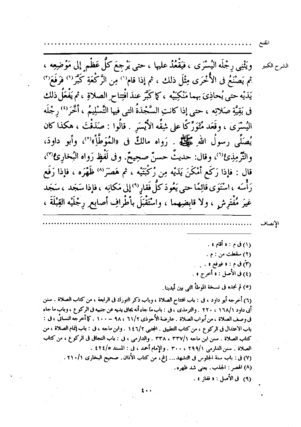 (¬6) أخرجه أبو داود، في: باب افتتاح الصلاة، وباب ذكر التورك في الرابعة، من كتاب الصلاة. سنن أبي داود 1/ 168، 220. والتِّرمذيّ، في: باب ما جاء أنَّه يجافي يديه عن جنبه في الركوع، وباب ما جاء في وصف الصلاة، من أبواب الصلاة. عارضة الأحوذي 2/ 69، 98 - 100. كما أخرجه النَّسائيّ، في: باب الاعتدال في الركوع، من كتاب التطبيق. المجتبي 2/ 146. وابن ماجه، في: باب إتمام الصلاة، من كتاب الصلاة. سنن ابن ماجه 1/ 337، 338. والدارمي، في: باب التجافي في الركوع، من كتاب الصلاة. سنن الدَّارميّ 1/ 299، 300. والإمام أَحْمد، في: المسند 5/ 424.