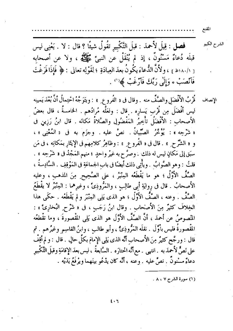 قُرْبُ الأفْضَلِ والصَّفِّ منه. وقال في «الفروعِ»: ويتوَجَّه احْتِمال أنَّ بُعْدَ يَميِنِه ليس أفْضلَ من قُرْبِ يَسارِه. قال: لعَلَّه مُرادُهم. الخامسةُ، قال بعضُ الأصحابِ: الأفْضَل تأخِيرُ المَفْضُولِ والصَّلاة مَكانَه. قال ابنُ رزِين في «شَرْحِه»: يُؤَّخَّرُ الصِّبْيانُ. نصَّ عليه. وجزَم به في «المُغْنِي»، و «الشَّرْحِ». قال في «الفروعِ»: وظاهِرُ كلامِهم في الإيثَارِ بمَكانِه، في مَن سبَق إلى مَكانٍ ليس له ذلك. وصرَّح به غيرُ واحدٍ؛ منهم المَجْدُ في «شَرْحِه». قلت: وهو الصَّوابُ. ويأْتِي ذلك أَيضًا في باب الجماعَةِ في المَوْقِفِ. السَّادِسة، الصَّفُّ الأوَّلُ؛ هو ما يقْطعُه المِنْبَرُ، على الصَّحِيحِ مِنَ المذهبِ، وعليه الأصحابُ. قال في رِوايَة أبِي طالِبٍ، والمَرُّوذِيِّ، وغيرهما: المِنْبرُ لا يقْطَعُ الصَّفَّ. وعنه، الصَّفُّ الأوَّلُ؛ هو الذى يَلِي المنْبَرَ ولم يَقْطَعْه. حكَى هذا الخِلافَ كثيرٌ مِن الأصْحابِ. وقال ابنُ رَجَبٍ، في «شَرْحِ البُخاريِّ»: المنْصوصُ عن أحمدَ، أنَّ الصَّفَّ الأوَّلَ هو الذى يَلى المقْصورةَ، وما تقْطعُه المقْصورةُ فليس بأوَّلَ. نقلَه المَرُّوذِيُّ، وأبو طالبٍ، وابنُ القاسمِ وغيرُهم. ثم قال: ورجَّح كثيرٌ منَ الأصحابِ أنَّه الذى يَلى الإمامَ بكلِّ حالٍ. قال: ولم أقِفْ على نَصٍّ لأحمدَ به. انتهى. مع أنَّه اخْتارَه. السَّابعةُ، ليس بعدَ الإقامَةِ وقبل التَّكْبير دعاء مسْنونٌ. نصَّ عليه. وعنه، أنَّه كان يدْعُو بينَها ويْرفَعُ يدَيْه.