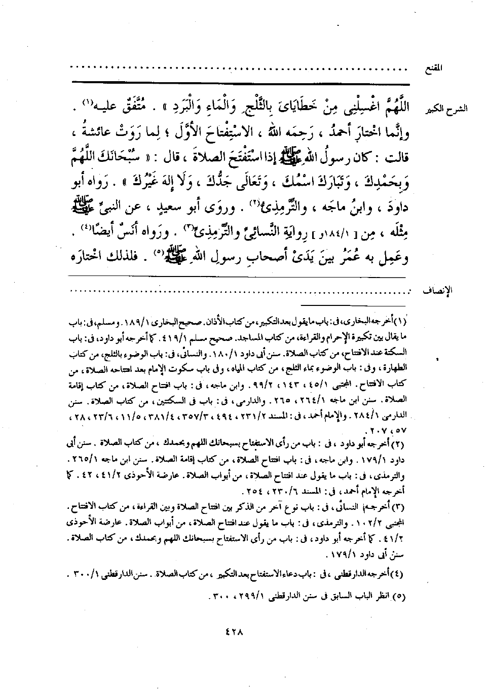 اللَّهُمَّ اغْسِلْنِي مِنْ خَطَايَاىَ بِالثَّلْج وَالْمَاءِ وَالْبَرَدِ». مُتَّفَقٌ عليه (¬1). وإنَّما اخْتارَ أحمدُ، رَحِمَه اللهُ، الاسْتِفْتاحَ الأوَّلَ؛ لمِا رَوَتْ عائشةُ، قالت: كان رسولُ اللهِ -صَلَّى الله عَلَيْهِ وَسَلَّم- إذا اسْتَفْتَحَ الصلاةَ، قال: «سُبْحَانَكَ اللَّهُمَّ وَبِحَمْدِكَ، وَتَبَارَكَ اسْمُكَ، وَتَعَالَى جَدُّكَ، وَلَا إِلهَ غَيْرُكَ». رَواه أبو داودَ، وابنُ ماجَه، والتِّرْمِذِيُّ (¬2). وروَى أبو سعيدٍ، عن النبيِّ -صَلَّى الله عَلَيْهِ وَسَلَّم- مِثْلَه، مِن رِوايَةِ النَّسائِيِّ والتِّرْمِذِيِّ (¬3). ورَواه أنَسٌ أَيضًا (¬4). وعَمِل به عُمَرُ بينَ يَدَيْ أصحابِ رسولِ اللهِ -صَلَّى الله عَلَيْهِ وَسَلَّم- (¬5). فلذلك اخْتارَه