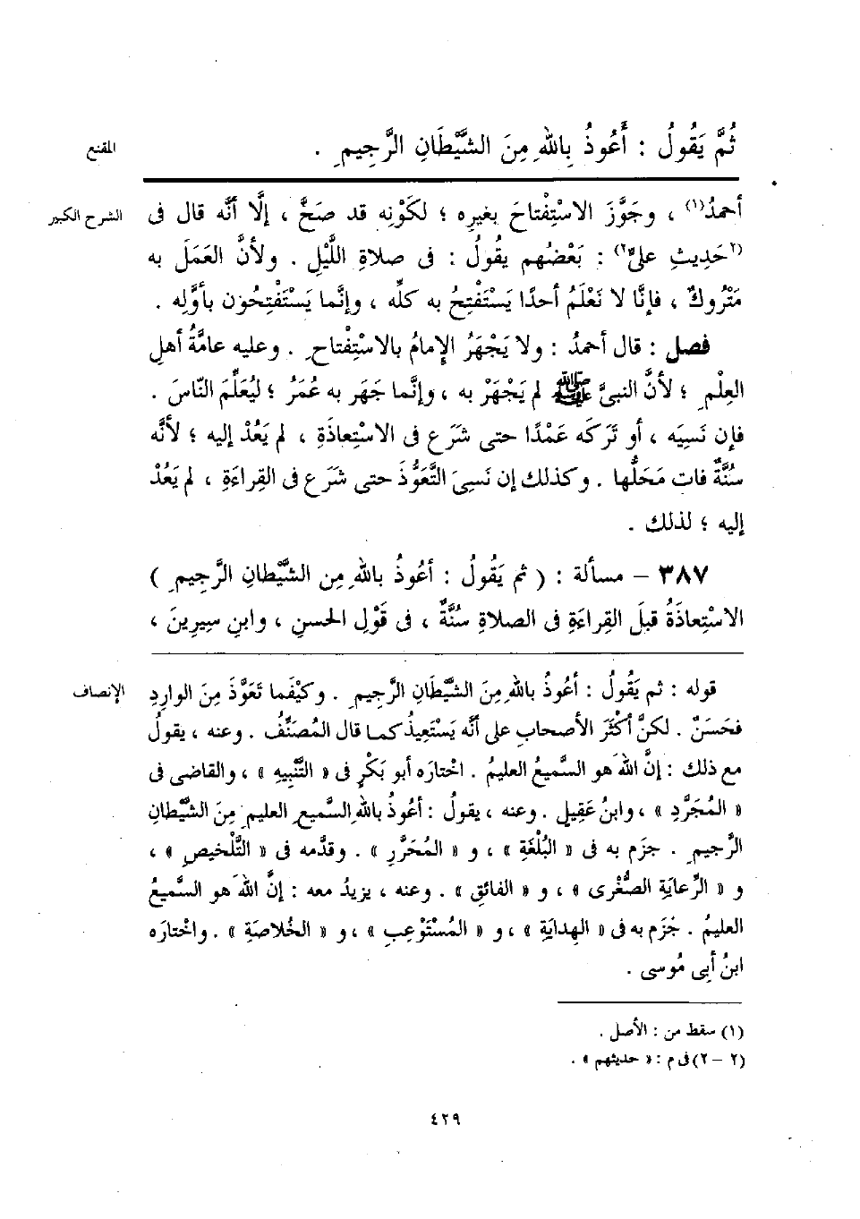 قوله: ثم يَقولُ: أعُوذُ بالله مِنَ الشَّيْطَانِ الرَّجِيمِ. وكيْفَما تَعَوَّذَ مِن الوارِدِ فحَسَنٌ. لكنَّ أكْثَرَ الأصحابِ على أنَّه يَسْتَعِيذُ كما قال المُصَنِّفُ. وعنه، يقولُ مع ذلك: إنَّ اللهَ هو السَّميعُ العليمُ. اخْتاره أبو بَكْرٍ في «التَّنْبِيه»، والقاضى في «المُجَرَّدِ»، وابنُ عَقِيل. وعنه، يقولُ: أعُوذُ باللهِ السَّميع العليمِ مِنَ الشَّيْطانِ الرَّجيمِ. جزَم به في «البُلْغَةِ»، و «المُحَرَّرِ». وقدَّمه في «التَّلْخيصِ»، و «الرَّعايَةِ الصُّغْرى»، و «الفائقِ». وعنه، يزيدُ معه: إنَّ الله هو السَّميعُ العليمُ. جَزَم به في «الهِدايَةِ»، و «المُسْتَوْعِبِ»، و «الخُلاصَةِ». واخْتارَه ابنُ أبِي مُوسى.