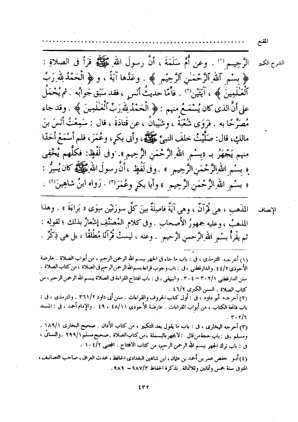 المذَهب، هي قرْآنُ، وهي آيَةٌ فاصِلَةٌ بينَ كلِّ سورَتَيْن سِوَى «بَراءَةَ». وهذا المذهبُ، وعليه جمهورُ الأصحابِ. وفي كلامِ المُصَنِّفِ إشْعارٌ بذلك؛ لقولِه: ثم يقْرأُ بسْمِ اللهِ الرَّحمن الرَّحيمِ. وعنه، ليستْ قُرْآنًا مُطْلقًا، بل هي ذِكْرٌ.