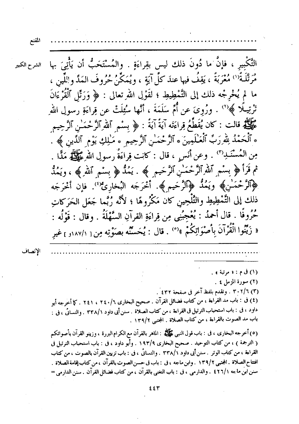 التَّكْبِيرِ، فإنَّ ما دُونَ ذلك ليس بقِراءَةٍ. والمُسْتَحَبُّ أن يَأْتِيَ بها مَرَتَّلَةً (¬1) مُعْرَبَةً، يَقِفُ فيها عندَ كلِّ آيَةٍ، ويُمَكِّنُ حُرُوفَ المَدِّ واللِّينِ، ما لم يُخْرِجْه ذلك إلى التَّمْطِيطِ؛ لقَوْلِ اللهِ تعالى: {وَرَتِّلِ الْقُرْآنَ تَرْتِيلًا} (¬2). ورُوِيَ عن أُمِّ سَلَمَةَ، أنَّها سُئِلَتْ عن قِراءَةِ رسولِ اللهِ -صَلَّى الله عَلَيْهِ وَسَلَّم- قالت: كان يُقَطِّعُ قِراءَتَه آيَةً آيَةً: {بِسْمِ اللهِ الرَّحْمَنِ الرَّحِيمِ * الْحَمْدُ لِلَّهِ رَبِّ الْعَالَمِينَ * الرَّحْمَنِ الرَّحِيمِ * مَالِكٍ يَوْمِ الدِّينِ}. مِن المُسْنَدِ (¬3). وعن أنَسٍ، قال: كانت قِراءَةُ رسولِ اللهِ -صَلَّى الله عَلَيْهِ وَسَلَّم- مَدًّا. ثم قَرَأ {بِسْمِ اللهِ الرَّحْمَنِ الرَّحِيمِ}. يَمُدُّ {بِسْمِ اللهِ}، ويَمُدُّ {الرَّحْمَنِ} ويَمُدُّ {الرَّحِيمِ}. أخْرَجَه البُخارِيُّ (¬4). فإن أخْرَجَه ذلك إلى التَّمْطِيطِ والتَّلْحِينِ كان مَكْرُوهًا؛ لأنَّه رُبَّما جَعَل الحَرَكاتِ حُرُوفًا. قال أحمدُ: يُعْجِبُنِي مِن قِراءَةِ القرآنِ السَّهْلَةُ. وقال: قَوْلُه: «زَيِّنُوا الْقُرْآنَ بِأصْوَاتِكُمْ» (¬5). قال: يُحَسِّنُه بصَوْتِه مِن غيرِ