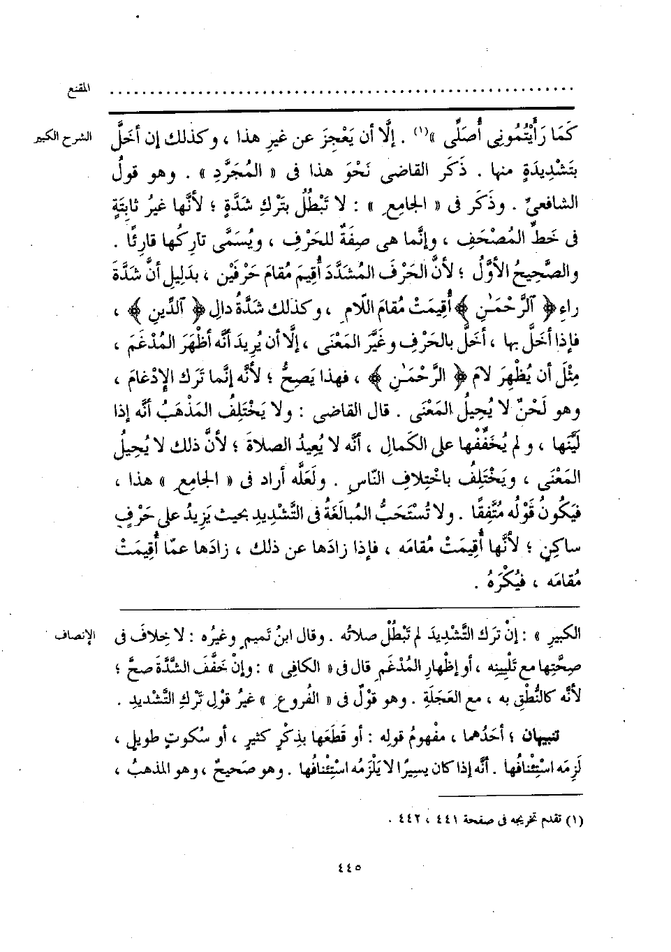 الكبيرِ»: إنْ ترَك التَّشْديدَ لم تَبْطُلْ صلاتُه. وقال ابنُ تَميمٍ وغيرُه: لا خِلافَ في صِحَّتِها مع تَلْيِينِه، أو إظْهارِ المُدْغَمِ قال في «الكافِي»: وإنْ خَفَّفَ الشَّدَّةَ صحَّ؛ لأنَّه كالنُّطْقِ به، مع العَجَلَةِ. وهو قوْلٌ في «الفُروعِ» غيرُ قوْلِ تَرْكِ التَّشْديدِ.