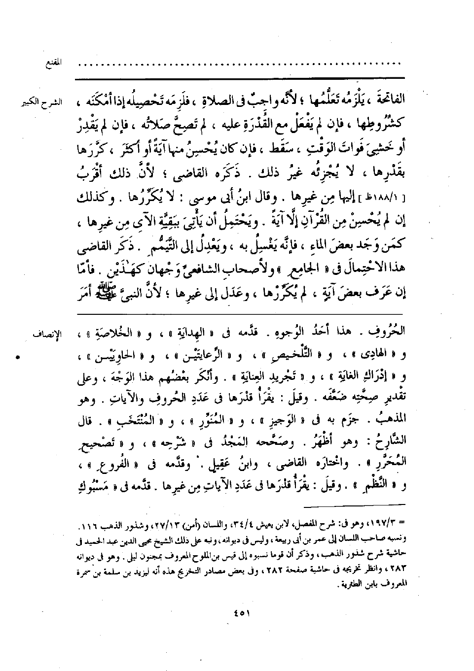 الحُرُوفِ. هذا أحَدُ الوُجوهِ. قدَّمه في «الهِدايَةِ»، و «الخُلاصَةِ»، و «الهادِي»، و «التَّلْخيصِ»، و «الرِّعايتَيْن»، و «الحاوِيَيْن»، و «إدْرَاكِ الغايَةِ»، و «تجْريدِ العِنايَةِ». وأنْكَر بعْضُهم هذا الوَجْهَ، وعلى تقْديرِ صِحَّتِه ضَعَّفَه. وقيل: يقْرَأُ قدْرَها في عَدَدِ الحُروفِ والآياتِ. وهو المذهبُ. جزَم به في «الوَجيزِ»، و «المُنَوِّرِ»، و «المُنْتَخَبِ». قال الشَّارِحُ: وهو أظْهَرُ. وصَحَّحه المَجْدُ في «شَرْحِه» و «تَصْحيحِ المُحَرَّرِ». واخْتارَه القاضي، وابنُ عَقِيلٍ. وقدَّمه في «الفُروعِ»، و «النَّظْمِ». وقيل: يقْرَأُ قدْرَها في عَدَدِ الآيات مِن غيرِها. قدَّمه في «مَسْبُوكِ