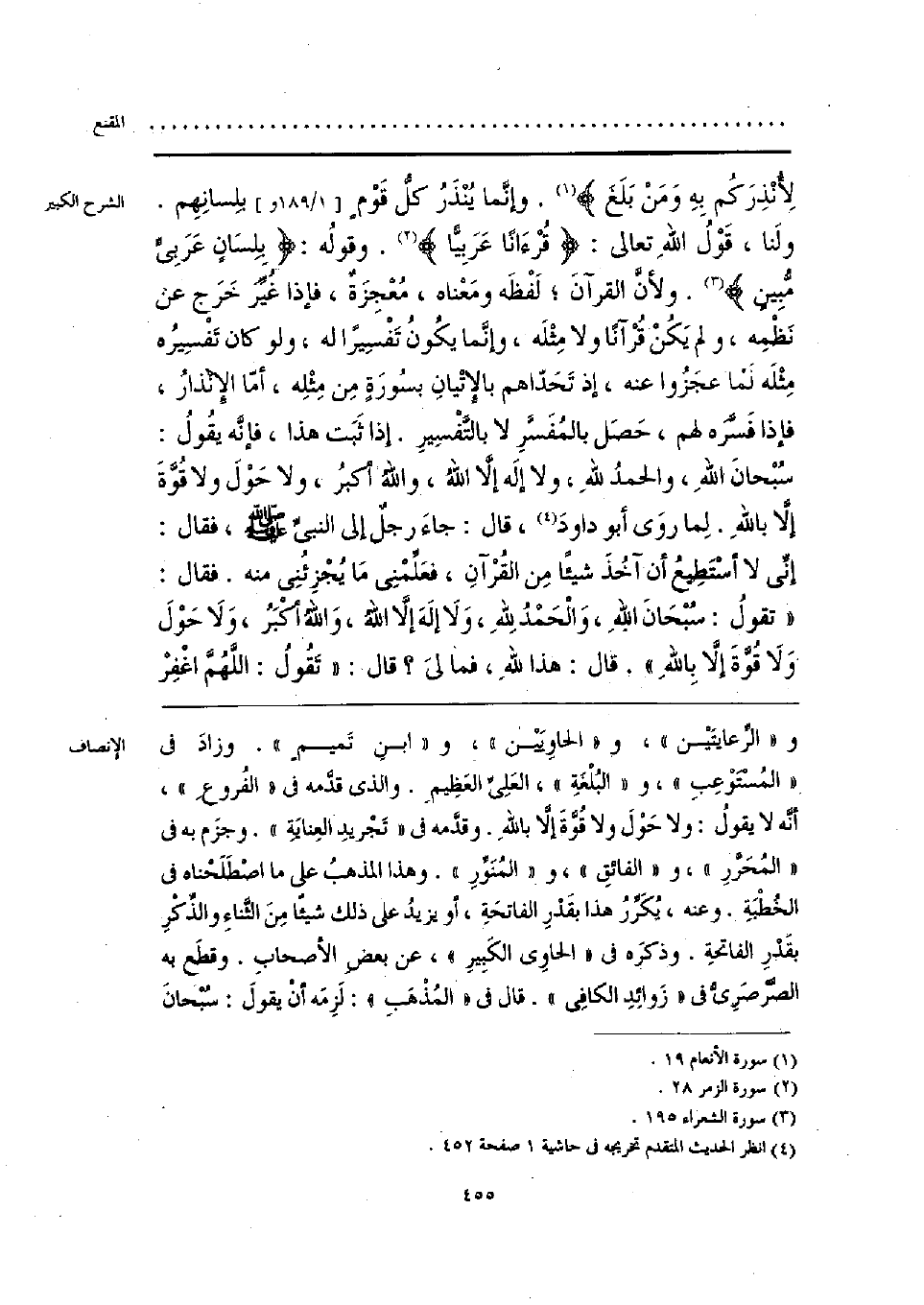 و «الرِّعايتَيْن»، و «الحاوِيَيْن»، و «ابنِ تَميمٍ». وزادَ في «المُسْتَوْعِبِ»، و «البُلْغَةِ»، العَلِيِّ العَظِيمِ. والذى قدَّمه في «الفُروعِ»، أنَّه لا يقولُ: ولا حَوْلَ ولا قُوَّةَ إلَّا باللهِ. وقدَّمه في «تَجْريدِ العِنايَةِ». وجزَم به في «المُحَرَّرِ»، و «الفائقِ»، و «المُنَوِّرِ». وهذا المذهبُ على ما اصْطَلَحْناه في الخُطْبَةِ. وعنه، يُكَرِّرُ هذا بقَدْرِ الفاتحَةِ، أو يزيدُ على ذلك شيئًا مِنَ الثَّناءِ والذِّكْرِ بقَدْرِ الفاتحةِ. وذكرَه في «الحاوِي الكَبِيرِ»، عن بعضِ الأصحابِ. وقطَع به الصَّرْصَرِيُّ في «زَوائِدِ الكافِي». قال في «المُذْهَبِ»: لَزِمَه أنْ يقولَ: سُبْحانَ