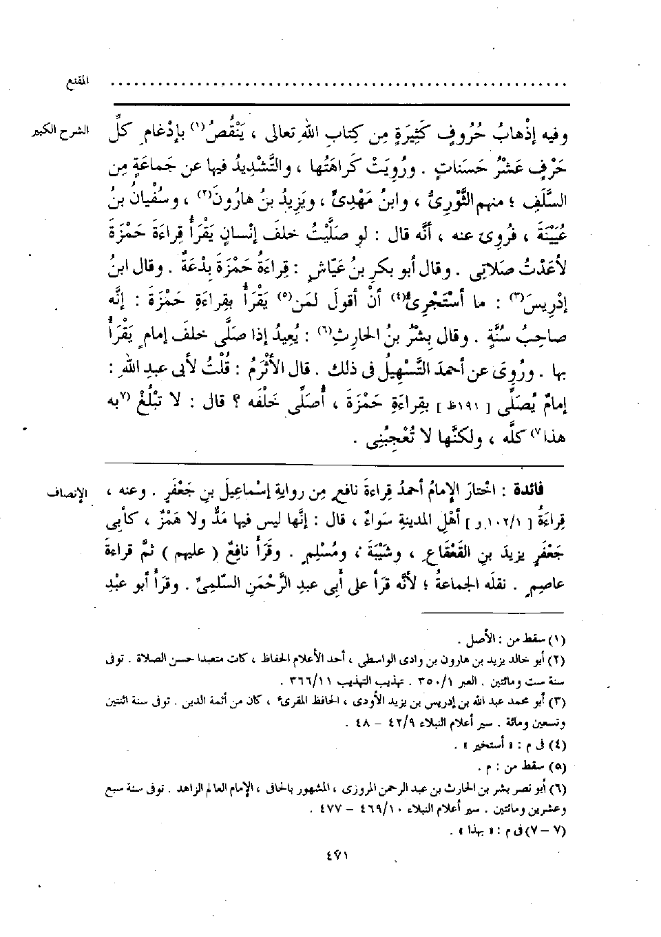فائدة: اخْتارَ الإِمامُ أحمدُ قراءةَ نافعٍ مِن روايةِ إسْمَاعِيلَ بنِ جَعْفَرٍ. وعنه، قِراءَةُ أهْلِ المدينةِ سَواءٌ، قال: إنَّها ليس فيها مَدٌّ ولا هَمْزٌ، كأبِي جَعْفَرٍ يزيدَ بنِ القَعْقَاعِ، وشَيْبَةَ، ومُسْلِم. وقَرَأَ نافِعٌ (عليهم) ثمَّ قراءةَ عاصِمٍ. نقلَه الجماعةُ؛ لأنَّه قرَأَ على أبِي عبدِ الرَّحْمَنِ السّلمِيِّ. وقرَأَ أبو عبْدِ