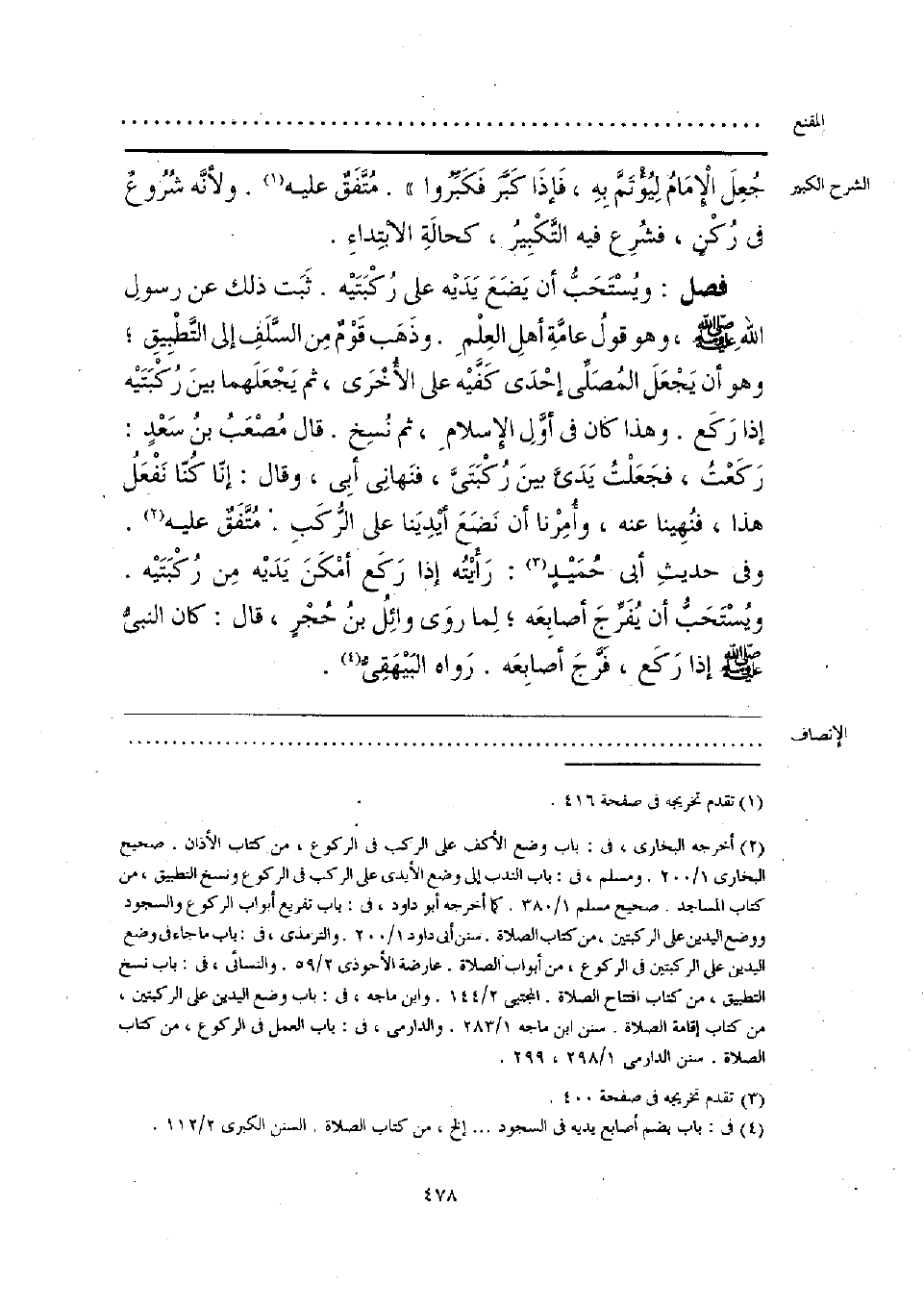 فصل: ويُسْتَحَبُّ أن يَضَعَ يَدَيْه على رُكْبَتَيْه. ثَبَت ذلك عن رسولِ اللهِ -صَلَّى الله عَلَيْهِ وَسَلَّم-، وهو قولُ عامَّةِ أهلِ العِلْمِ. وذَهَب قَوْمٌ بن السَّلَفِ إلى التَّطْبِيقِ؛ وهو أن يَجْعَلَ المُصَلِّي إحْدَى كَفَّيْه على الأُخْرَى، ثم يَجْعَلَهما بينَ رُكْبَتَيْه إذا رَكَع. وهذا كان في أوَّلِ الإِسلامِ، ثم نُسِخ. قال مُصْعَبُ بنُ سَعْدٍ: رَكَعْتُ، فجَعَلْتُ يَدَيَّ بينَ رُكْبَتَيَّ، فنَهانِي أبِي، وقال: إنّا كُنّا نَفْعَلُ هذا، فنُهِينا عنه، وأُمِرْنا أن نَضَعَ أيْدِيَنا على الرُّكَبِ. مُتَّفَقٌ عليه (¬2). وفي حديثِ أَبى حُمَيْدٍ (¬3): رَأَيْتُه إذا رَكَع أمْكَنَ يَدَيْه مِن رُكْبَتَيْه. ويُسْتَحَبُّ أن يُفَرِّجَ أصابِعَه؛ لِما روى وائِلُ بنُ حُجْرٍ، قال: كان النبيُّ -صَلَّى الله عَلَيْهِ وَسَلَّم- إذا رَكَع، فَرَّجَ أصابِعَه. رَواه البَيْهَقِيُّ (¬4).