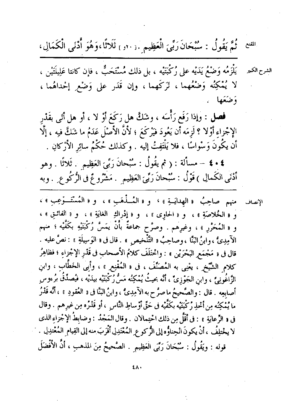 منهم صاحِبُ «الهِدايَةِ»، و «المُذْهَبِ»، و «المُسْتَوْعِبِ»، و «الخُلاصَةِ»، و «الحاوِي»، و «إدْراكِ الغايَةِ»، و «الفائقِ»، و «المُحَرَّرِ»، وغيرِهم. وصرَّح جماعةٌ بأَنْ يمَسَّ رُكْبَتَيْهِ بكَفَّيْه؛ منهم الآمِدِيُّ، وابنُ البَنَّا، وصاحِبُ «التَّلْخيصِ». قال في «الوَسِيلَةِ»: نصَّ عليه. قال في «مَجْمَعِ البَحْرَيْن»: واخْتَلَفَ كلامُ الأصحابِ في قَدْرِ الإجْزاءِ؛ فظاهِرُ كلامِ الشَّيْخِ، يعْنِي به المُصَنِّفَ، في «المُقْنِعِ»، وأبِي الخَطَّابِ، وابن الزَّاغُونِيِّ، وابنِ الجَوْزِيِّ، أنَّه بحيثُ يُمْكِنُه مَسُّ رُكْبَتَيْه بيدَيْه، فيُصدِّقُ برُءوسِ أصابِعِه. قال: والصَّحيحُ ما صرَّح به الآمِديُّ، وابنُ البَنَّا في «العُقودِ»، أنَّه قَدْرُ ما يُمْكِنُه مِن أخْذِ رُكْبَتَيْه بكَفَّيْه في حَقِّ أوْساطِ النَّاسِ، أو قَدْرُه مِن غيرِهم. وقال في «الرِّعايَةِ»: في أقَلَّ مِن ذلك احْتِمالان. وقال المَجْدُ: وضابِط الإجْزاءِ الذى لا يخْتلِفُ، أنْ يكونَ انْحِناؤُه إلى الرُّكوعِ المُعْتَدِلِ أقْرَبَ منه إلى القِيامِ المُعْتدِلِ.