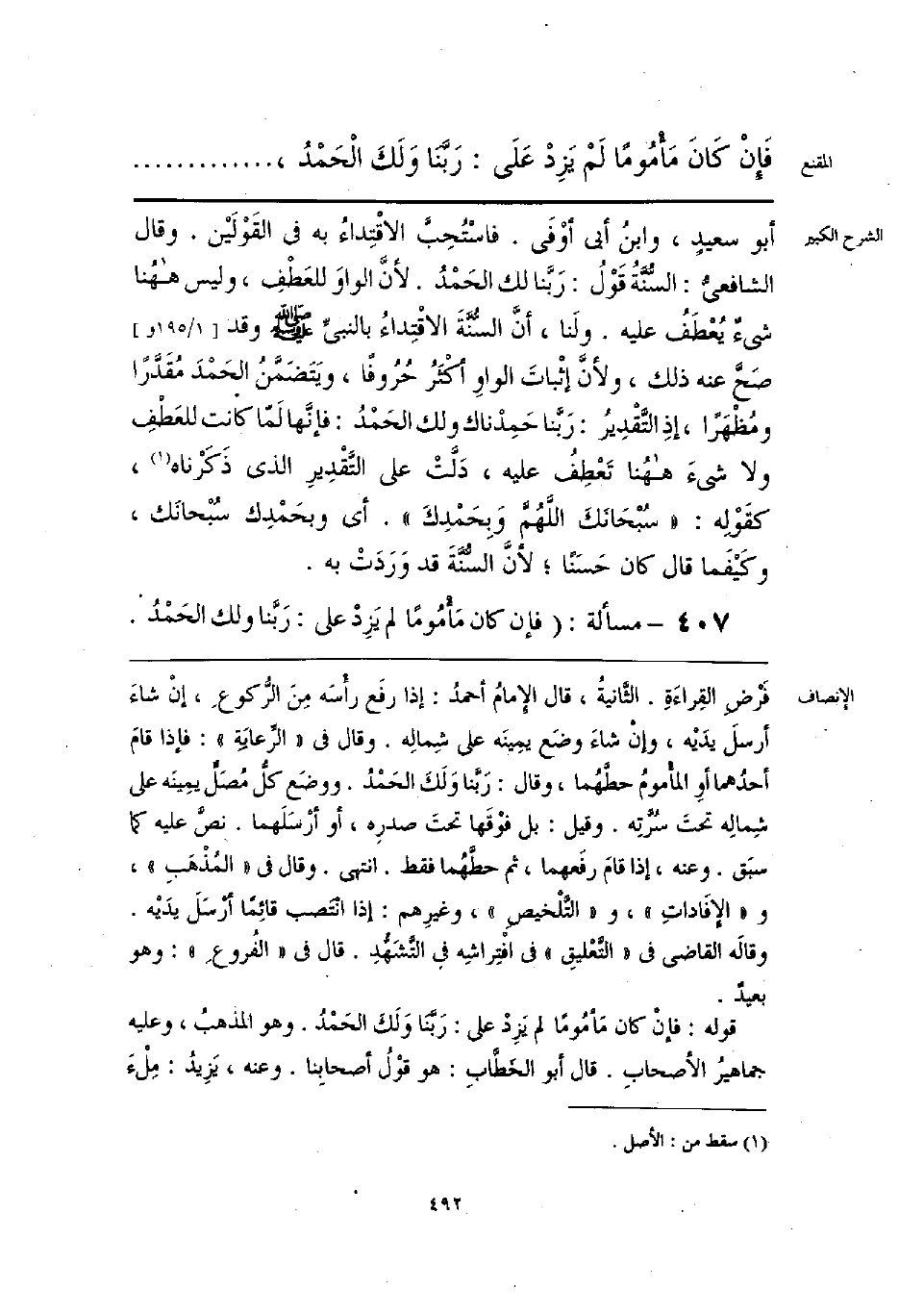 فَرْضِ القِراءَةِ. الثَّانيةُ، قال الإمامُ أَحْمد: إذا رفَع رأسَه مِنَ الرّكوعِ، إن شاءَ أرسلَ يدَيْه، وإنْ شاءَ وضَع يمينَه على شِمالِه. وقال في «الرعايَة»: فإذا قامَ أحدُهما أوِ المأمومُ حطَّهُما، وقال: رَبَّنَا وَلكَ الحَمْدُ. ووضَع كل مُصَلِّ يمِينَه على شِمالِه تحتَ سُرَّتِه. وقيل: بل فوْقَها تحتَ صدرِه، أو أرْسَلَهما. نصَّ عليه كما سبَق. وعنه، إذا قامَ رفَعهما، ثم حطَّهُما فقط. انتهى. وقال في «المُذْهَبِ»، و «الإفَاداتِ»، و «التلْخيص»، وغيرِهم: إذا انتصب قائِمًا أرْسَلَ يدَيْه. وقالَه القَاضى في «التعْليقِ» في افْتِراشِه في التَّشَهُّدِ. قال في «الفُروعِ»: وهو بعيدٌ.