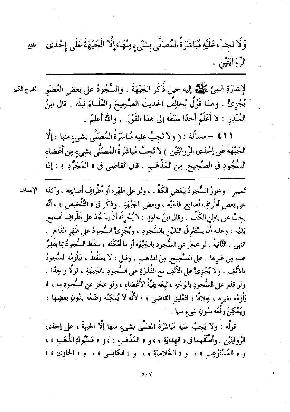 قولُه: ولا يَجِبُ عليه مُبَاشرة المصلَّى بشيء منها إلَّا الجبهةَ، على إحدَى الرِّوايَتَيْن. وأطْلَقَهما في «الهدايَةِ»، و «المُذْهَبِ» و «مَسْبُوكِ الذَّهَبَ»، و «المُسْتَوْعِبِ»، و «الخلاصَةِ»، و «الكافِي»، و «الحاوي»؛