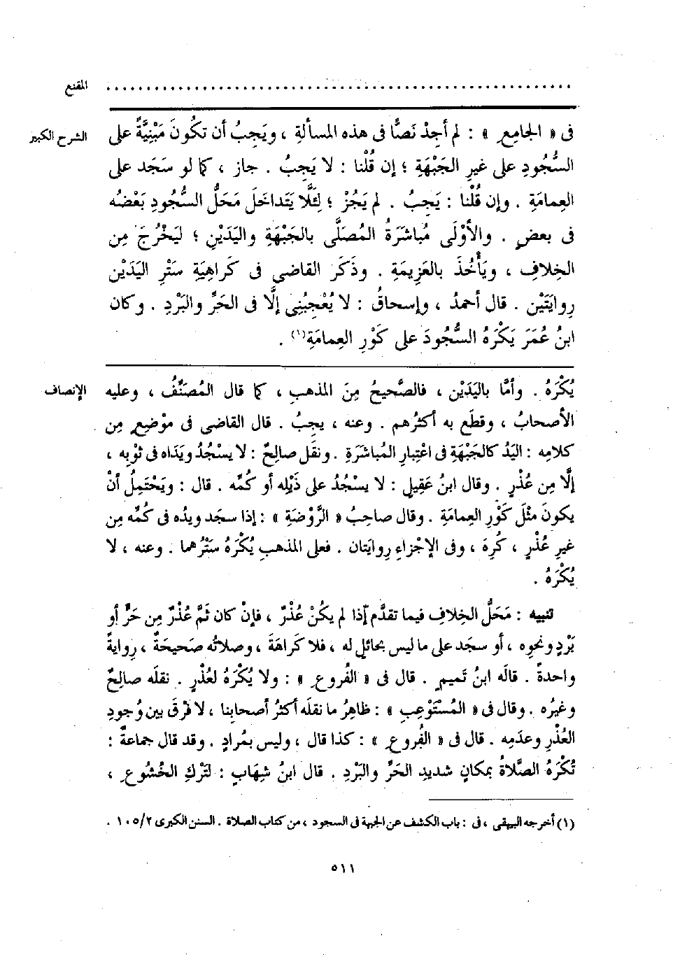 يُكْرَهُ. وأمَّا باليَدَيْن، فالصَّحيحُ مِنَ المذهب، كما قال المُصَنفُ، وعليه الأصحابُ، وقطَع به أكثرُهم. وعنه، يجِبُ. قال القاضي في موْضِع مِن كلامِه: اليَدُ كالجَبْهَةِ في اعْتِبارِ المُباشَرَةِ. ونقَل صالِحٌ: لا يسْجُدُ ويَدَاه في ثَوْبِه، إلَّا مِن عُذْرٍ. وقال ابنُ عَقِيل: لا يسْجُدُ على ذَيْلِه أو كُمه. قال: ويَحْتَمِلُ أنْ كونَ مثْلَ كَوْرِ العِمامَةِ. وقال صاحِبُ «الروْضَةِ» إذا سجَد ويدُه في كُمِّه مِن غير عُذْر، كُره، وفي الإجْزاءِ رِوايَتان. فعلى المذهبِ يُكْرَهُ سَتْرُهما. وعنه، لا يُكْرَهُ.