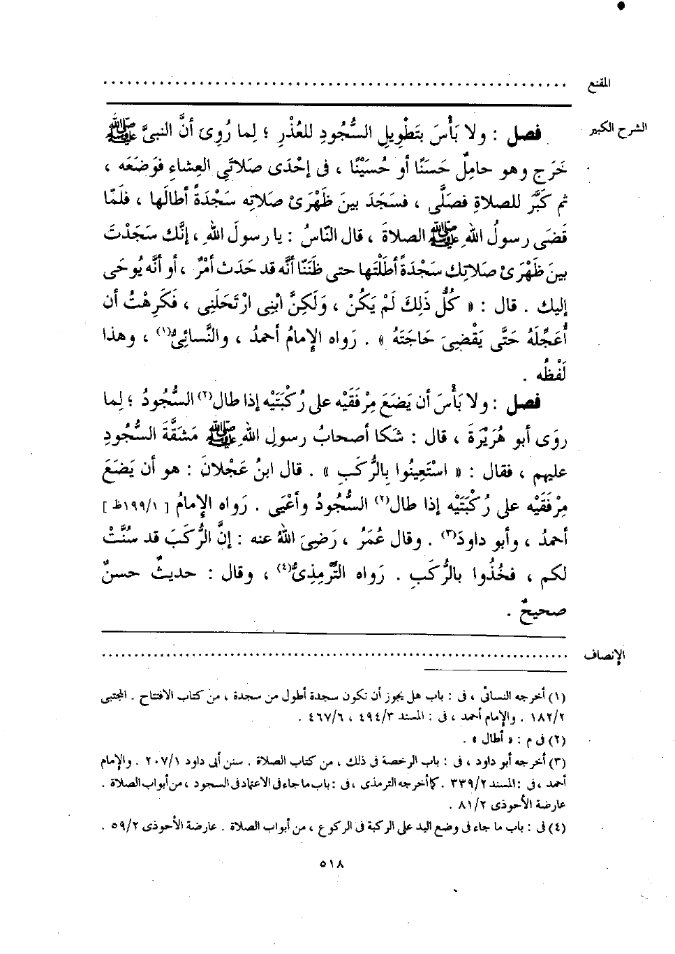 فصل: ولا بَأْسَ أن يضَعَ مرفَقَيْه على رُكبْتيْه إذا طال (¬2) السجُودُ؛ لِما روَى أبو هُرَيرةَ، قال: شَكا أصحابُ رسولِ اللهِ -صَلَّى الله عَلَيْهِ وَسَلَّم- مَشَقَّةَ السجُودِ عليهم، فقال: «اسْتَعِينُوا بِالركبِ». قال ابنُ عَجْلانَ: هو أن يَضَعَ مِرْفَقَيْه على رُكْبتيْه إذا طال (2) السُّجُودُ وأعْيىَ. رَواه الإمامُ أحمدُ، وأبو داودَ (¬3). وقال عُمَرُ، رضىَ اللهُ عنه: إنَّ الرُّكَبَ قد سُنَّتْ لكم، فخُذُوا بالرُّكَبِ. رَواه الترمِذِيُّ (¬4)، وقال: حديثٌ حسنٌ صحيحٌ.
