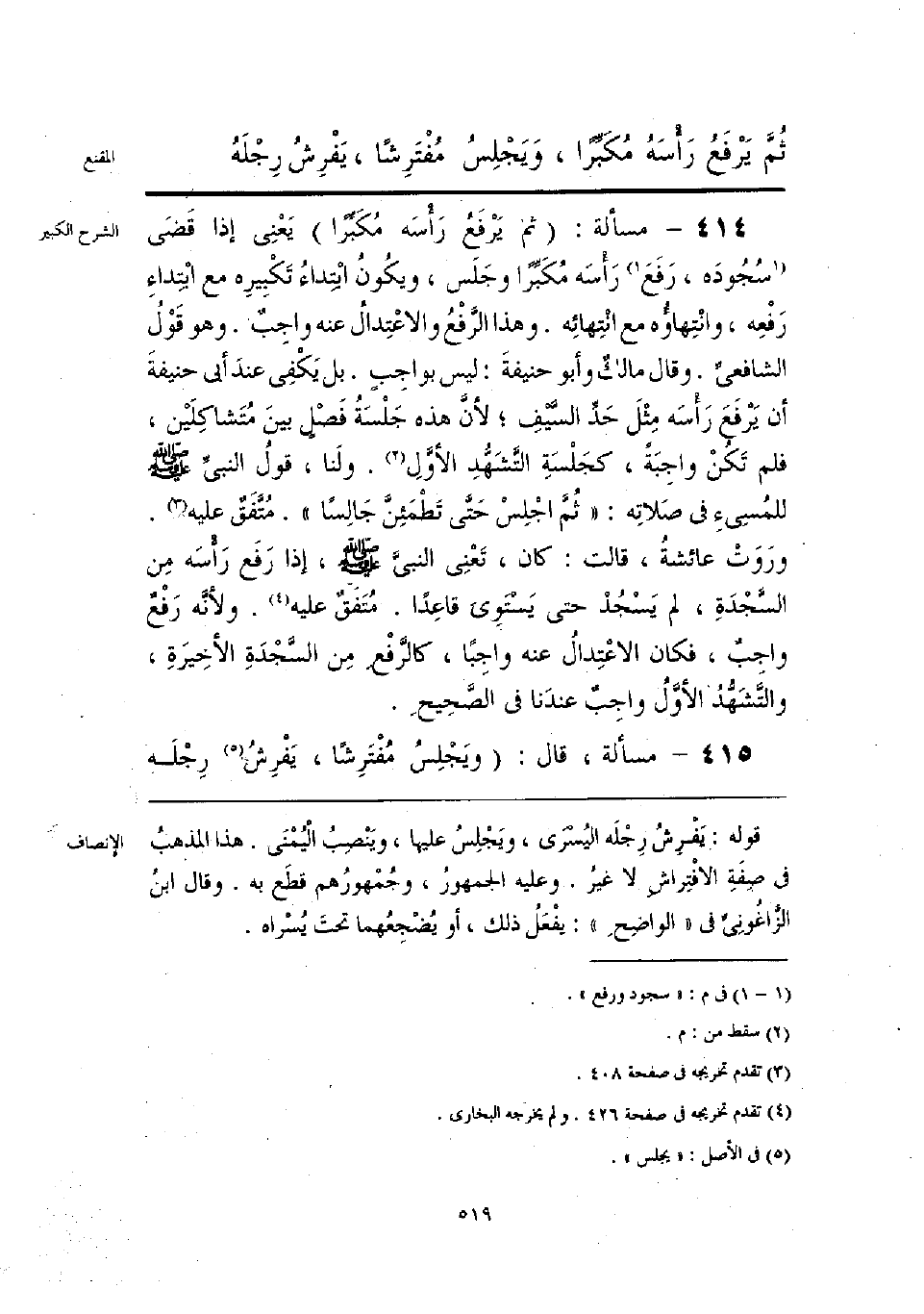 ثُمَّ يَرفَعُ رأسَهُ مُكَبرًا، وَيَجْلِسُ مُفْتَرِشًا، يَفْرِشُ رِجْلَهُ