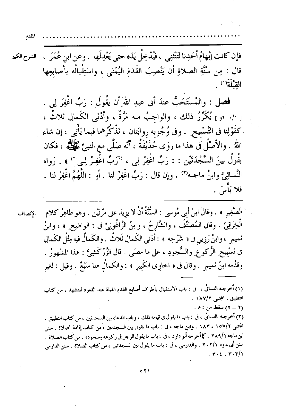 الصغير». وقال ابن أبي موسى: السَّنة أنْ لا يزيدَ على مرَّتْيْن. وهو ظاهِرُ كلام الخرقىّ. وقال المصَنفُ، والشّارح، وابن الزاغونى في «الواضحِ»، وابن تميم، وابنُ رزِين في «شرحِه»: أدْنَى الكمالِ ثَلاث. والكَمال فيه مِثْل الكمالِ في تسبيح الرّكوعِ والسُّجود، على ما مضَى. قال الزَّركَشِي: هذا المشْهورُ. وقدَّمه ابنُ تَميم. وقال في «الحاوِي الكبيرِ»: والكمال هنا سبعٌ. وقيل: لغير
