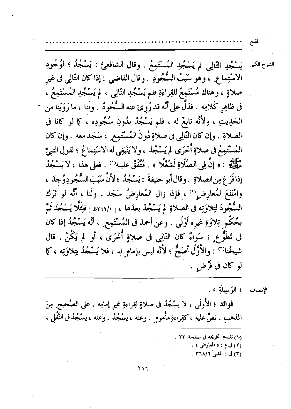 فوائد؛ الأولَى، لا يسْجدُ في صلاه لقِراءةِ غيرِ إمامِه. على الصَّحيحِ مِنَ المذهبِ. نص عليه، كقِراءةِ مأموم. وعنه، يسْجُدُ. وعنه، يسْجُد في النفْلِ،