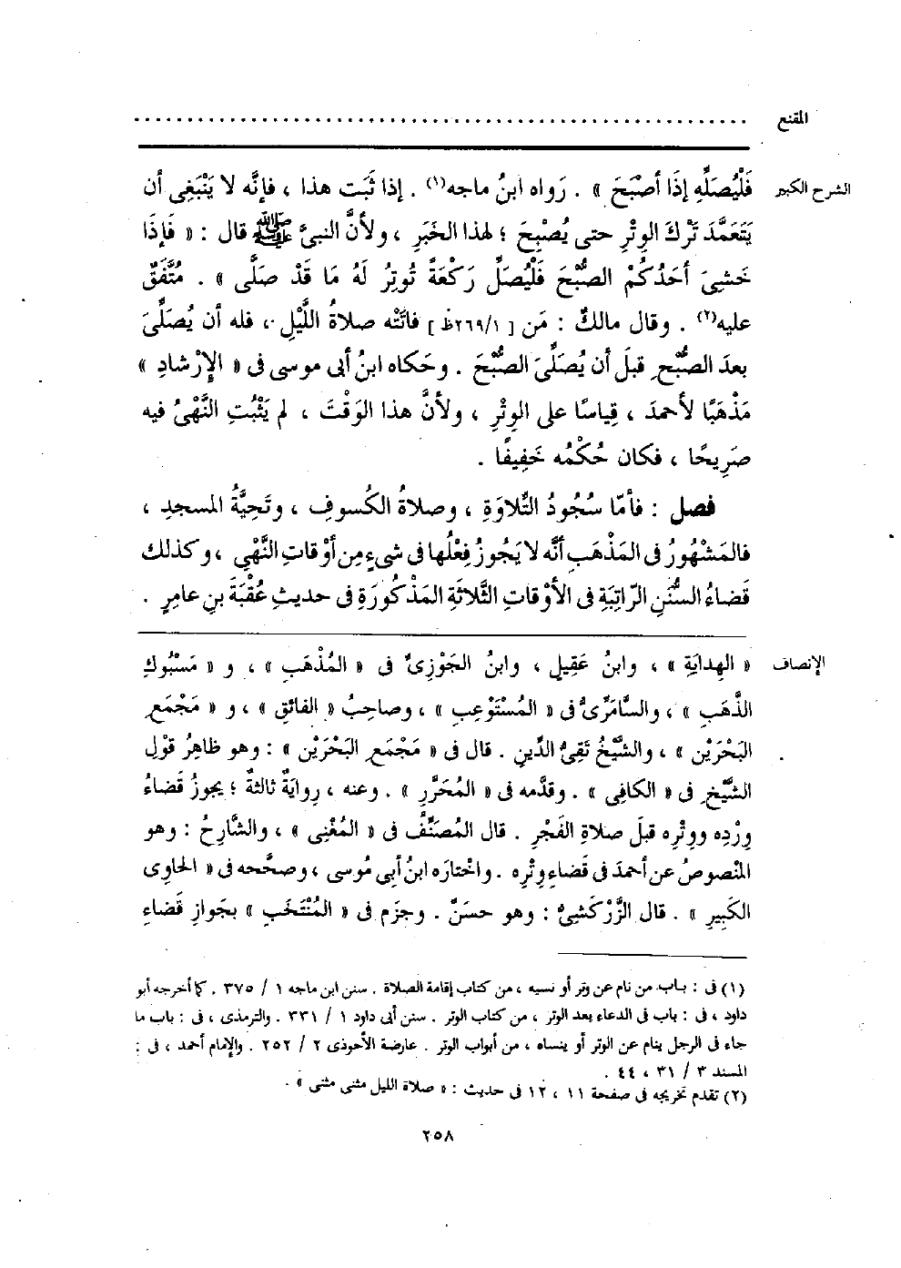 «الهدايةِ»، وابنُ عَقِيل، وابنُ الجَوْزِي في «المذهب»، و «مَسْبوك الذهب»، والسامَريُّ في «المُسْتَوْعِبِ»، وصاحب «الفائقِ»، و «مَجْمَع البَحرَين»، والشيخُ تقِي الدين. قال في «مَجْمع البَحرَين»: وهو ظاهِر قوْلِ الشيخِ في «الكافِي». وقدمه في «المُحَررِ». وعنه، روايَة ثالثة؛ يجوزُ قَضاء وردِه ووتْره قبلَ صلاةِ الفَجْرِ. قال المُصنف في (المُغني)، والشارح: وهو المنْصوصُ عن أحمدَ في قضاءِ وتْره. واخْتارَه ابن أبِي موسى، وصحّحه في «الحاوي الكِبير». قال الزّركشي: وهو حسَن. وجزم في «المنتخب» بجَوازِ قَضاء