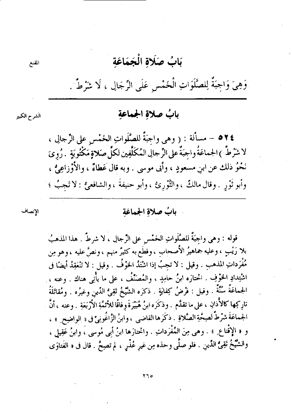 قوله: هي واجِبَةٌ للصلواتِ الخمس على الرجالِ، لا شرط. هذا المذهب؛ بلا رَيبٍ، وعيه جماهير الأصحابِ، وقطَع به كثير مهما، ونصَّ عليه، وهو منِ مفْرَداتِ المذهبِ. وقيل: لا تجب إذا اشْتَد الخوْف. وقيل: لا تَنْعَقِد أيضًا في اشْتِدادِ الخوفِ. اختاره ابنُ حامِد، والمصنِّف، على ما يأتي هناك. وعنه، الجماعة سنة. وقيل: فرض كفاية. ذكرَه الشيخ تقِي الدِّينِ وغيره. ومقاتلَة تارِكِها كالأذانِ، على ما تقدم. وذكَره ابن هبيرَةَ وفاقًا للأئمةِ الأربعَةِ. وعنه، أن الجماعَةَ شرطٌ لصحة الصلاة. ذكَرَها القاضي، وابن الزاغونِي في «الواضِحَ»، و «الإقْناع». وهي مِنَ المُفْرَداتِ. واختارَها ابنُ أبِي موسى، وابن عَقِيل، والشيخ تقِي الدينِ. فلو صلى وحدَه مِن غير عذْرٍ، لم تصِح. قال في «الفتاوى