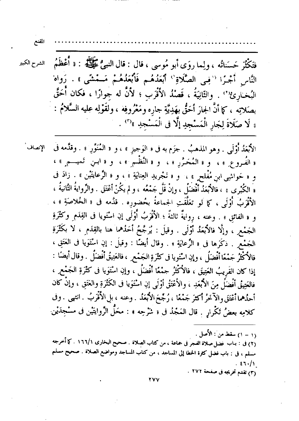 الأبعَدُ أوْلى. وهو المذهبُ. جزم به في «الوجيزِ»، و «المُنورِ». وقدمه في «الفروعِ»، و «المحَررِ»، و «النظْمِ»، و «ابنِ تميم»، و «حواشِي ابن مفلحٍ»، و «تجْريدِ العِناية»، و «الرعايتَين». زادَ في «الكبرى»، فالأبعد أفْضَل، وإنْ قل جَمعُه، ولم يكنْ أعتقَ. والرواية الثانيةُ، الأقرب أوْلى، كما لو تعَلَّقتِ الجماعة بحُضورِه. قدَّمه في «الخلاصةِ»، و «الفائقِ». وعنه، رِواية ثالثة، الأقْرب أولى إذِ اسْتويا في القِدمِ وكثْرَةِ الجمع، وإلا فالأبعدُ أوْلَى. وقيلَ: يرجح أحَدهما هنا بالقِدَمِ، لا بكثْرَةِ الجمع. ذكرها في «الرعاية». وقال أيضًا: وقيلَ: إن اسْتَويا في العَتَقِ، فالأكْثرُ جَمعًا أفْضل، وإنِ استَويا في كثرةِ الجَمع، فالعَتيق أفْضلُ. وقال أيضًا: إذا كان القَريب العَتِيق، فالأكْثر جمعا أفْضَل، وإنِ استوَيا في كثْرَةِ الجَمع، فالعَتِيقُ أفْضَل مِنَ الأبعد، والأعتق أوْلَى إنِ استوَيا في الكَثْرةِ والعَتَقِ، وإن كان أحدُهما أعتَقَ والآخَر أكثرَ جمعًا، رجحَ الأبعدُ. وعنه، بلِ الأقرب. انتهى. وفي كلامه بعضُ تكْرارٍ. قال المجْدُ في «شرحِه»: محَل الروايتْين في مسْجِدَين