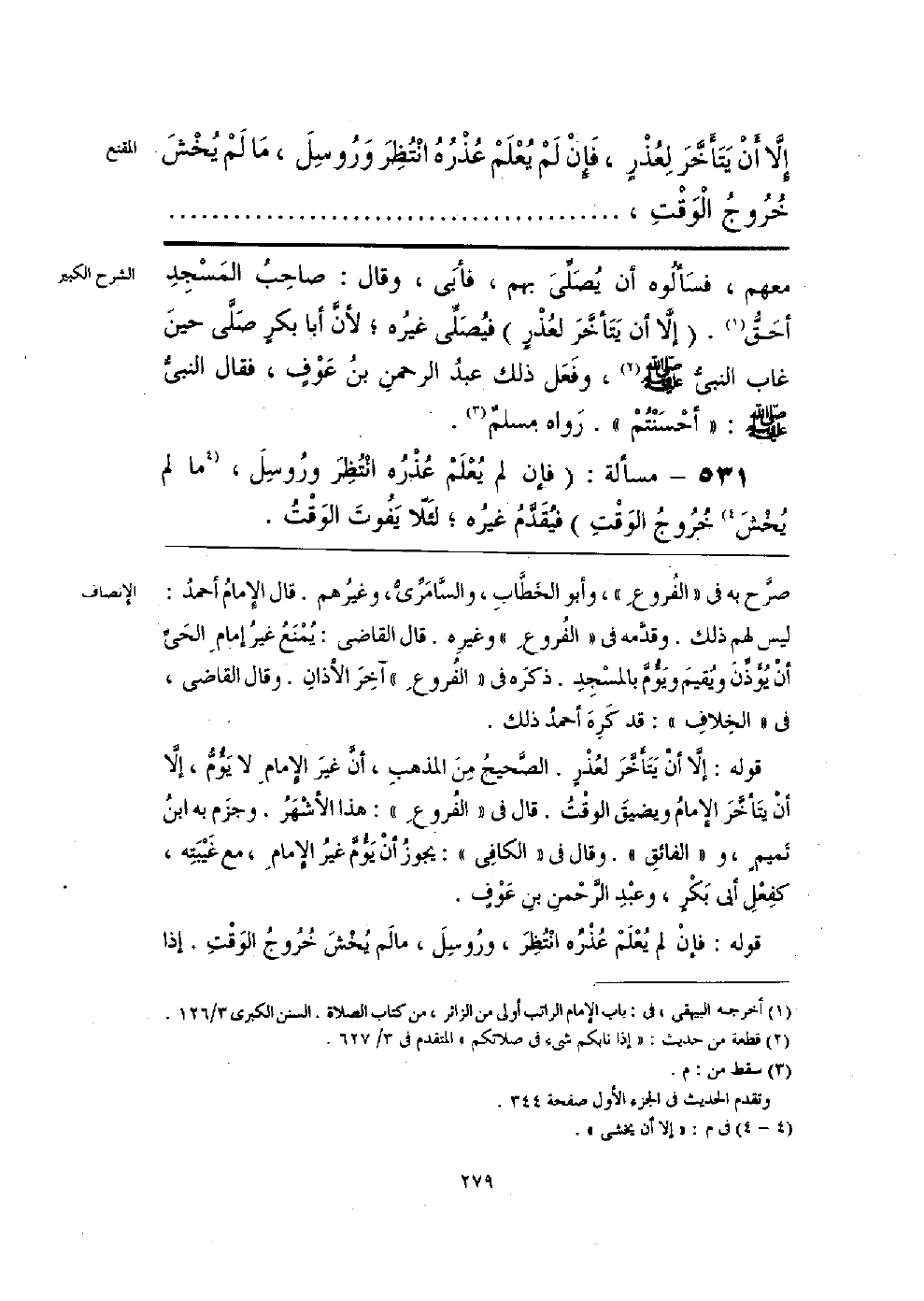 قوله: إلَّا أن يتأخرَ لغذْرٍ. الصحيح مِن المذهب، أن غيرَ الإمامِ لا يؤمّ، إلَّا أنْ يتَأخرَ الإمام ويضيقَ الوقْتُ. قال في «الفروعِ»: هذا الأشْهرُ. وجزَم به ابنُ تميم، و «الفائق». وقال في «الكافي»: يجوز أنْ يَؤم غيرُ الإمامِ، مع غَيبَته، كفعلِ أبي بكر، وعبْدِ الرحمنِ بن عَوْفٍ.