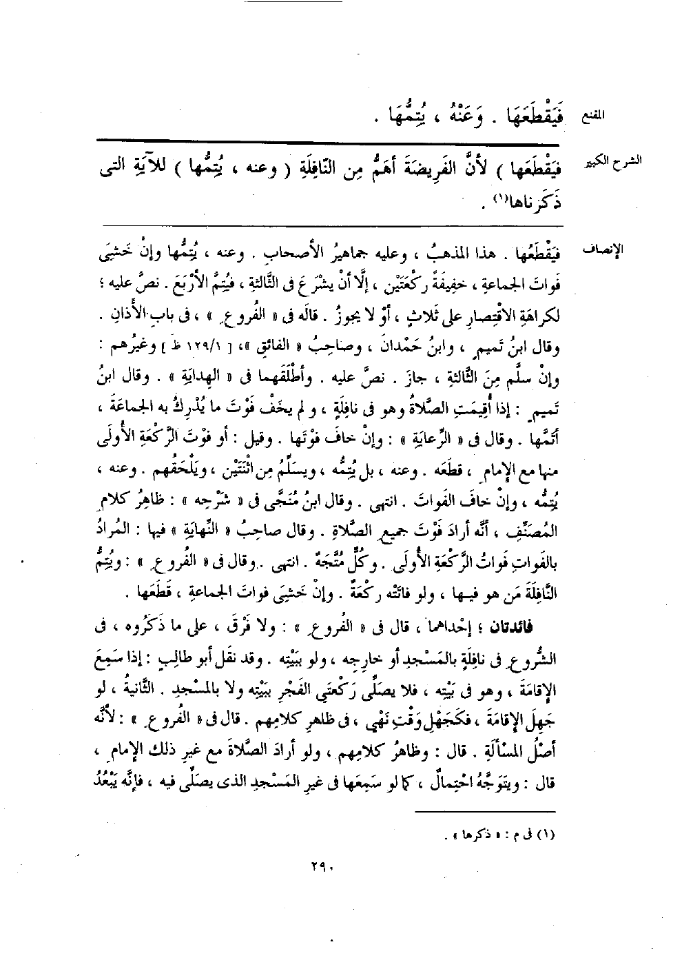 فيَقْطَعُها. هذا المذهبُ، وعليه جماهيرُ الأصحابِ. وعنه، يُتِمُّها وإنْ خَشِيَ فَواتَ الجماعةِ، خفِيفَةٌ ركْعَتَين، إلَّا أنْ يشْرَعَ في الثَّالثةِ، فيُتِمَّ الأرْبَعَ. نصَّ عليه؛ لكراهَةِ الاقْتِصارِ على ثَلاثٍ، أوْ لا يجوزُ. قاله في «الفُروعِ»، في بابِ الأذانِ. وقال ابنُ تَميمٍ، وابنُ حَمْدانَ، وصاحِبُ «الفائقِ» وغيرُهم: وإنْ سلَّم مِنَ الثَّالثةِ، جازَ. نصَّ عليه. وأطْلَقَهما في «الهِدايَةِ».وقال ابنُ تَميمٍ: إذا أُقِيمَتِ الصَّلاةُ وهو في نافِلَةٍ، ولم يخَفْ فَوْتَ ما يُدْرِكُ به الجماعَةَ، أتَمَّها. وقال في «الرِّعايَةِ»: وإنْ خافَ فوْتَها. وقيل: أو فوْتَ الرْكْعَةِ الأُولَى منها مع الإمامِ، قطَعَه. وعنه، بل يُتِمُّه، ويسَلَّمُ مِن اثْنَتَين، ويَلْحَقُهم. وعنه، يُتِمُّه، وإنْ خافَ الفَواتَ. انتهى. وقال ابنُ مُنَجَّى في «شَرْحِه»: ظاهِرُ كلامِ المُصَنِّفِ، أنَّه أرادَ فَوْتَ جميعِ الصَّلاةِ. وقال صاحِبُ «النَّهايَةِ» فيها: المُرادُ بالفَواتِ فَواتُ الرَّكْعَةِ الأُولَى. وكُلٌّ مُتَّجَهٌ. انتهى. وقال في «الفُروعِ»: ويُتمُّ النَّافِلَةَ مَن هو فيها، ولو فاتَتْه ركْعَةٌ. وإنْ خَشِيَ فواتَ الجماعةِ، قَطَعَها.