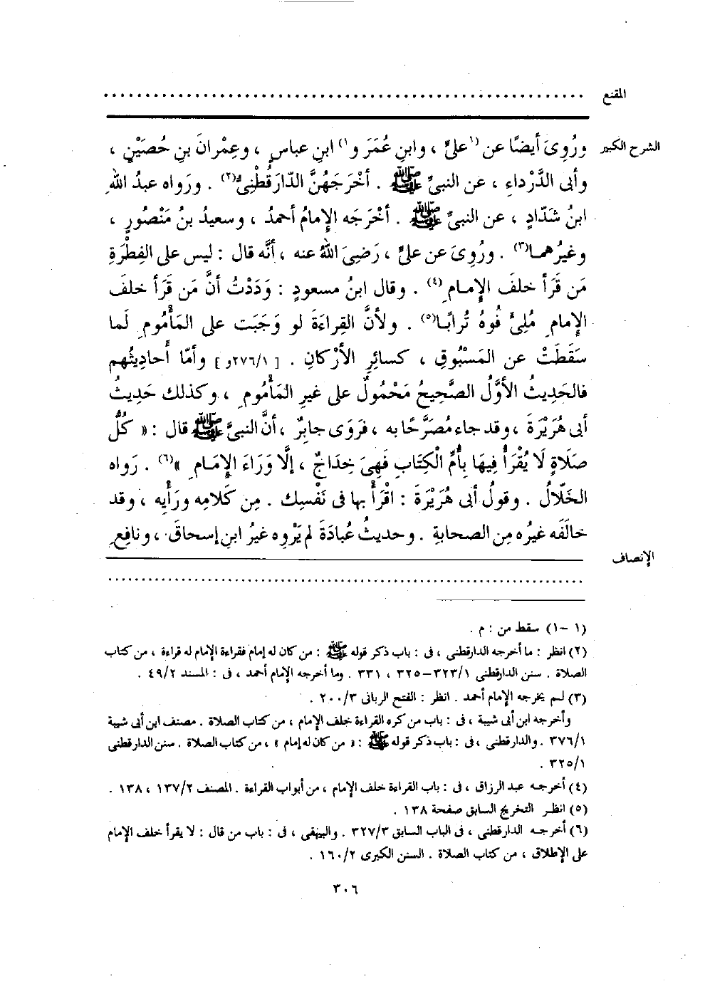 (¬2) انظر: ما أخرجه الدارقطني، في: باب ذكر قوله صلى الله عليه وسلم: من كان له إمام فقراءة الإمام له قراءة، من كتاب الصلاة. سنن الدارقطني 1/ 323 - 325، 331. وما أخرجه الإمام أحمد، في: المسند 2/ 49.