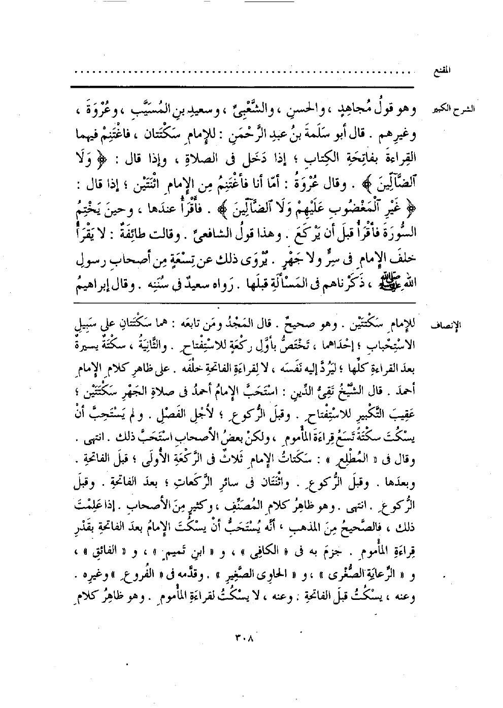 للإمامِ سَكْتتَين. وهو صحيحٌ. قال المَجْدُ ومَن تابعه: هما سَكْتَتانِ على سَبِيلِ الاسْتِحْبابِ؛ إحْدَاهما، تَخْتَصُّ بأوَّلِ ركْعَةٍ للاسْتِفْتاحِ. والثَّانِيَةُ، سكْتَةٌ يسيرةٌ بعدَ القراءةِ كلِّها؛ ليَرُدَّ إليه نَفَسَه، لا لِقراءَةِ الفاتحةِ خلْفَه. على ظاهرِ كلامِ الإِمامِ أحمدَ. قال الشَّيخُ تَقِيُّ الدِّينِ: اسْتَحَبَّ الإِمامُ أحمدُ في صلاةِ الجَهْرِ سَكْتَتين؛ عَقِيب التَّكْبيرِ للاسْتِفْتاحِ. وقبلَ الرُّكوعِ؛ لأجْلِ الفَصْلِ. ولم يَسْتَحبَّ أنْ يسْكُتَ سكْتَةَ تَسَعُ قِراءَةَ المأْمومِ، ولكنْ بعضُ الأصحابِ اسْتَحَبَّ ذلك. انتهى. وقال في «المُطْلِعِ»: سَكَتاتُ الإِمامِ ثَلاثٌ في الرَّكْعَةِ الأُولَى؛ قبلَ الفاتحةِ. وبعدَها. وقبلَ الرُّكوعِ. واثْنَتَان في سائرِ الرَّكَعاتِ؛ بعدَ الفاتحِة. وقبلَ الرُّكوعِ. انتهى. وهو ظاهِرُ كلامِ المُصَنِّفِ، وكثيرٍ مِنَ الأصحابِ. إذا عَلِمْتَ ذلك، فالصَّحيحُ مِن المذهبِ، أنَّه يُسْتَحَبُّ أنْ يسْكُتَ الإِمامُ بعدَ الفاتحةِ بقَدْرِ قِراءَةِ المأْمومِ. جزمَ به في «الكافِي»، و «ابن تميمٍ»، و «الفائقِ»، و «الرِّعايَةِ الصُّغْرى»، و «الحاوي الصَّغِيرِ». وقدَّمه في «الفُروعِ» وغيرِه. وعنه، يسْكُتُ قبلَ الفاتحةِ: وعنه، لا يسْكُتُ لقراءَةِ المأْمومِ. وهو ظاهِرُ كلامِ