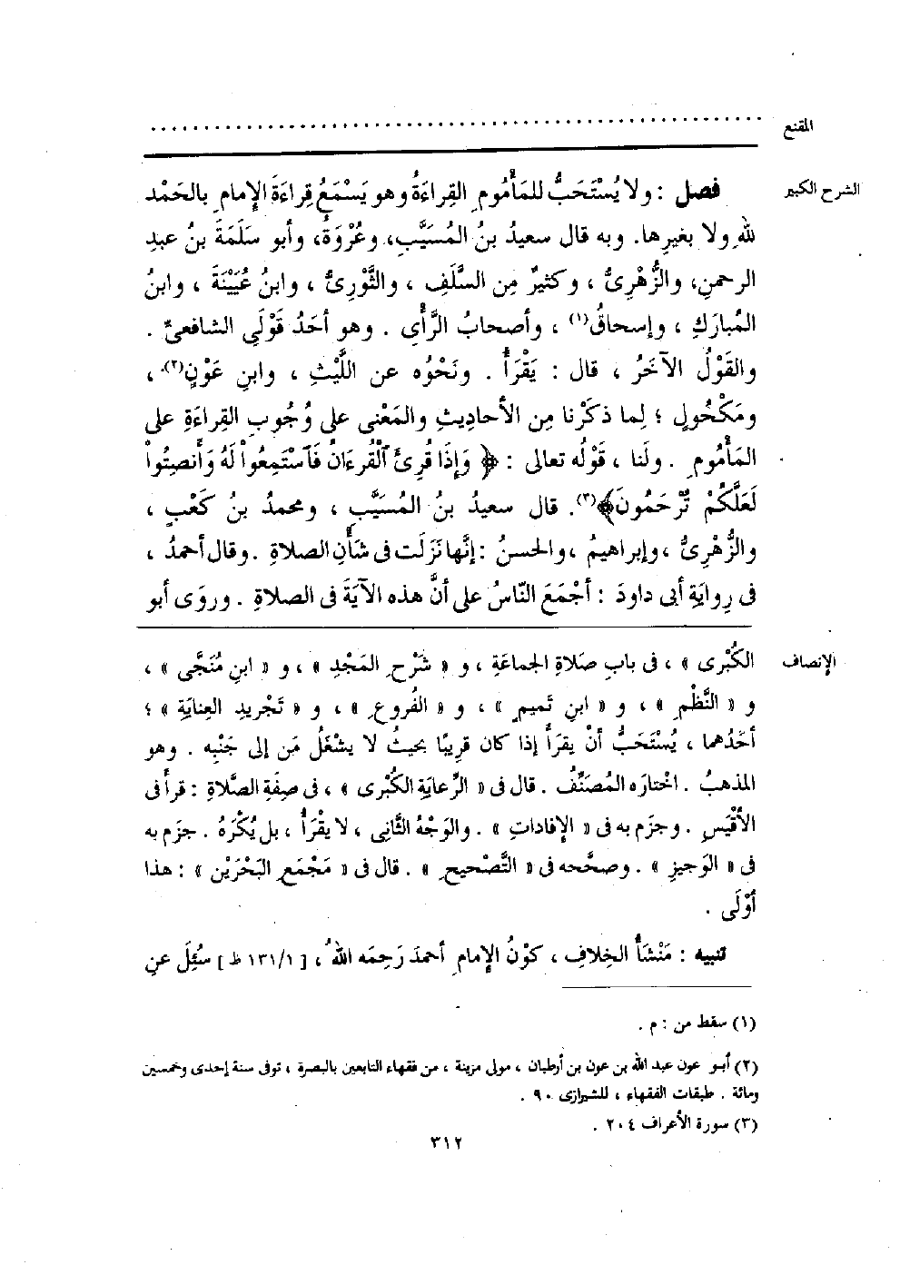 الكُبْرى»، في بابِ صَلاةِ الجماعَةِ، و «شَرْحِ المَجْدِ»، و «ابنِ مُنَجَّى»، و «النَّظْم»، و «ابنِ تَميمٍ»، و «الفُرعِ»، و «تَجْريدِ العِنايَةِ»؛ أحدُهما، يُسْتَحَبُّ أنْ يقرَأَ إذا كان قرِيبًا بحيثُ، يشْغَلُ مَن إلى جَنْبِه. وهو المذهبُ. اخْتارَه المُصَنِّفُ. قال في «الرِّعايَةِ الكُبْرى»، في صِفَةِ الصَّلاةِ: قرأ في الأقْيَسِ. وجزَم به في «الإِفاداتِ». والوَجْهُ الثَّانِي، لا يقْرَأُ، بل يُكْرَهُ. جزَم به في «الوَجيزِ». وصحَّحه في «التَّصْحيحِ». قال في «مَجْمَعِ البَحْرَيْن»: هذا أوْلَى.