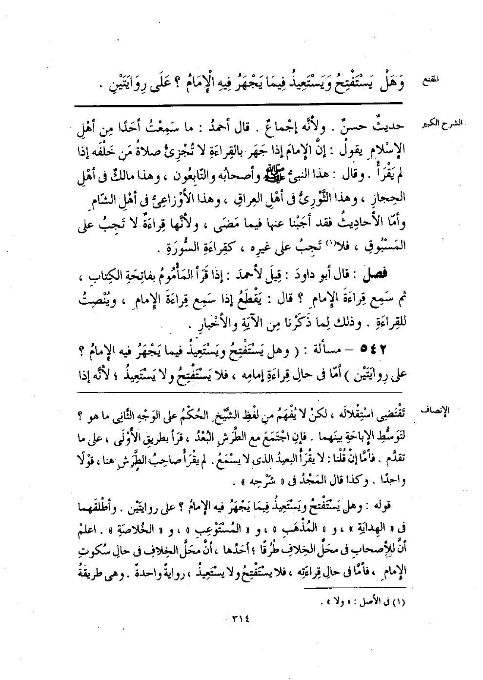 قوله: وهل يَسْتفْتحُ ويَسْتَعِيذُ فِيمَا يَجْهَر فيه الإِمامُ؟ على روايتَيْن، وأطْلقَهما في «الهِدايَةِ»، و «المُذْهَبِ»، و «المُستوْعِبِ»، و «الخُلاصَةِ». اعلمْ أنَّ للأصحابِ في محَلَّ الخِلافِ طُرُقًا؛ أحَدُها، أنَّ محَلَّ الخِلافِ في حالِ سُكوتِ الإمامِ، فأمَّا في حالِ قِراءَتِه، فلا يسْتَفْتِحُ ولا يسْتَعِيذُ، روايةً واحدةً. وهي طريقَةُ